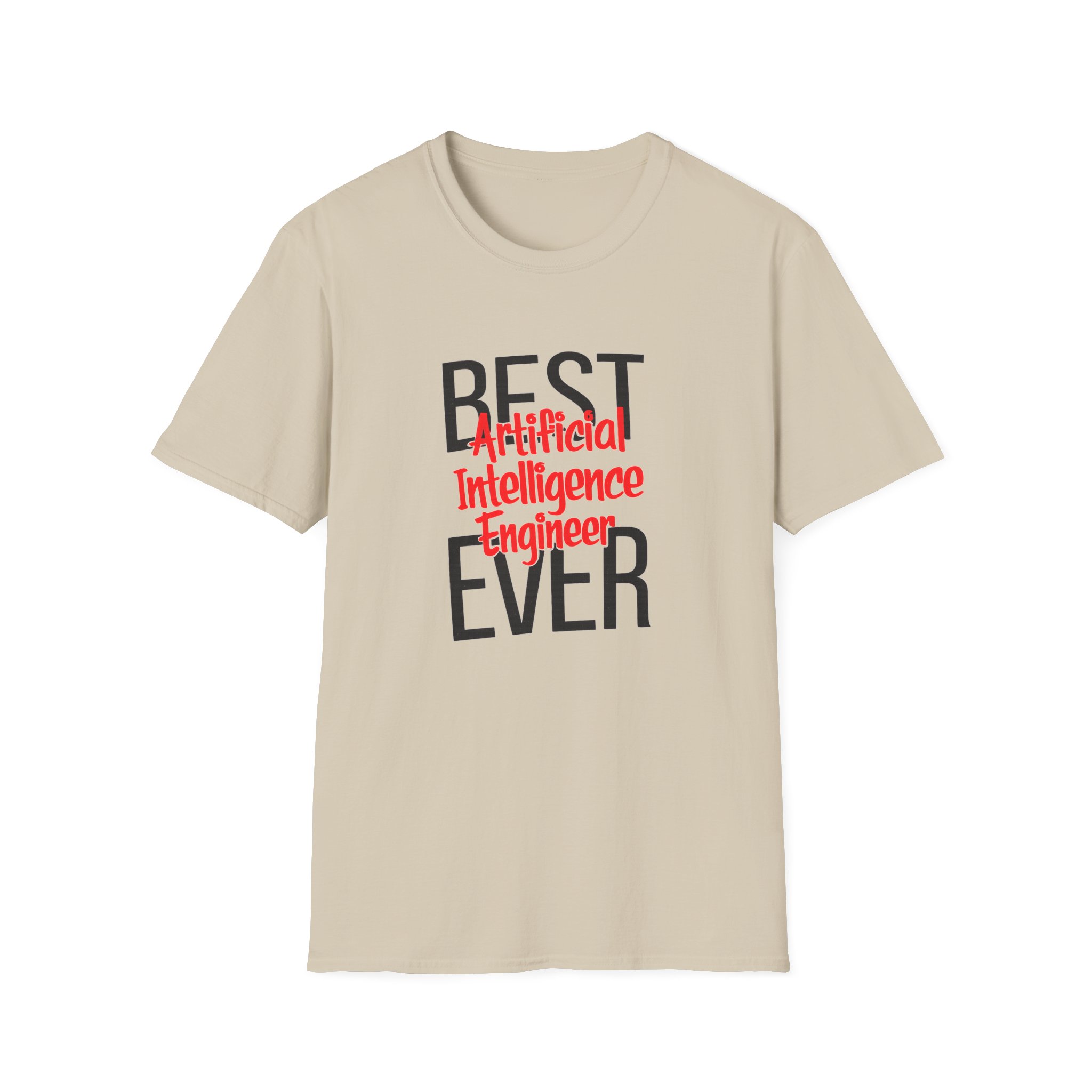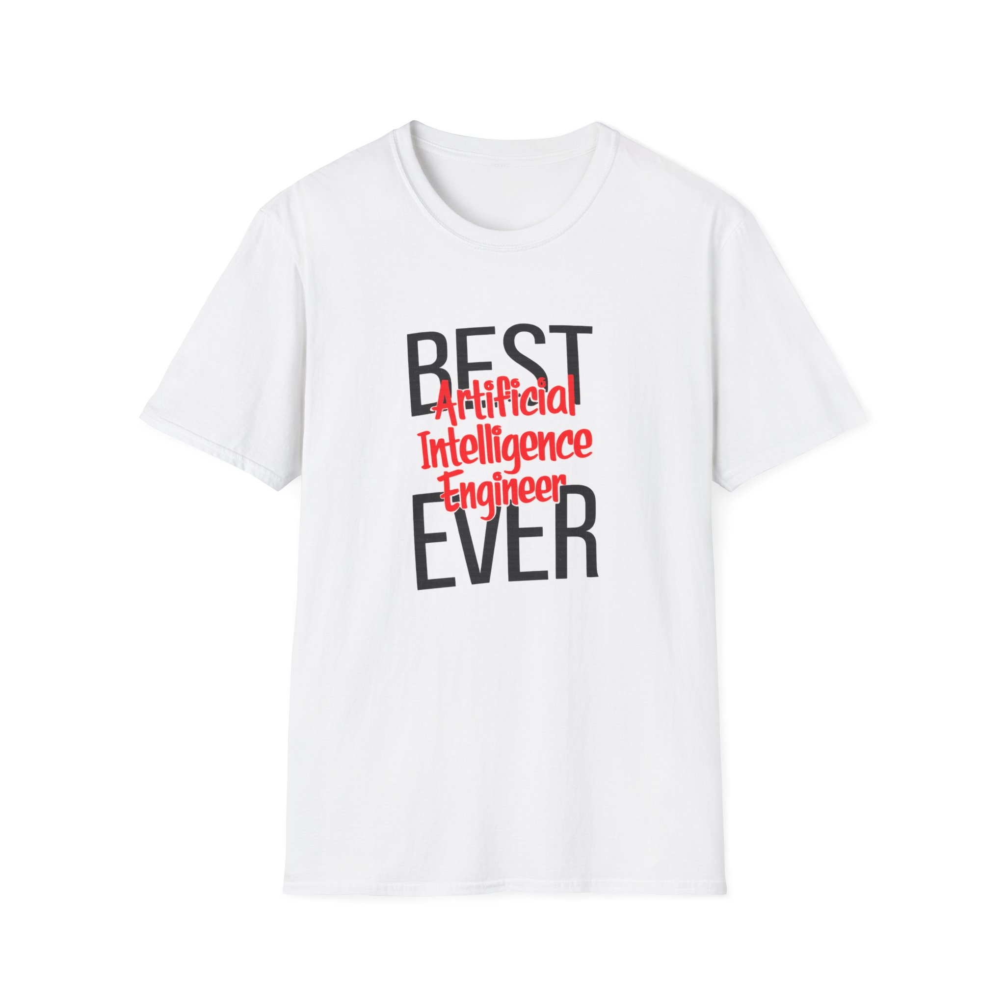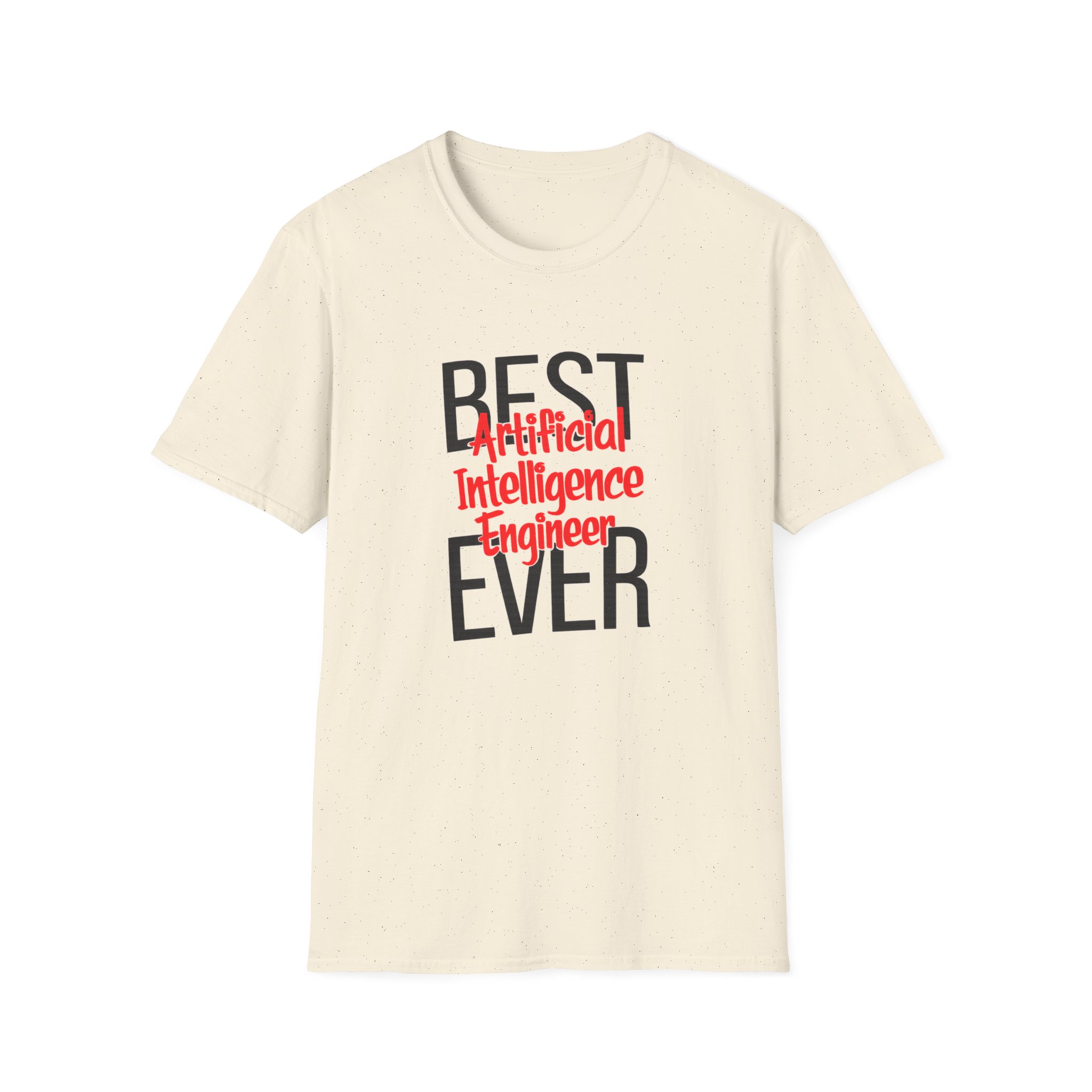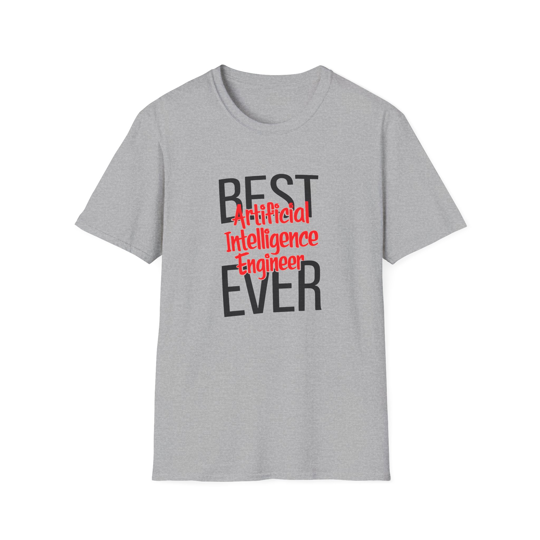 The typography does everything here. “BEST” and “EVER” in oversized distressed gray block letters frame the composition like a monument, while “Artificial Intelligence Engineer” cuts through the center in bold red decorative script — confident, warm, and impossible to miss. Pure black background makes the red pop with the energy of something that means what it says. This isn’t a subtle shirt. It’s a declaration. The kind worn by the person on the team who consistently ships what others said couldn’t be done, and has absolutely stopped pretending to be modest about it.