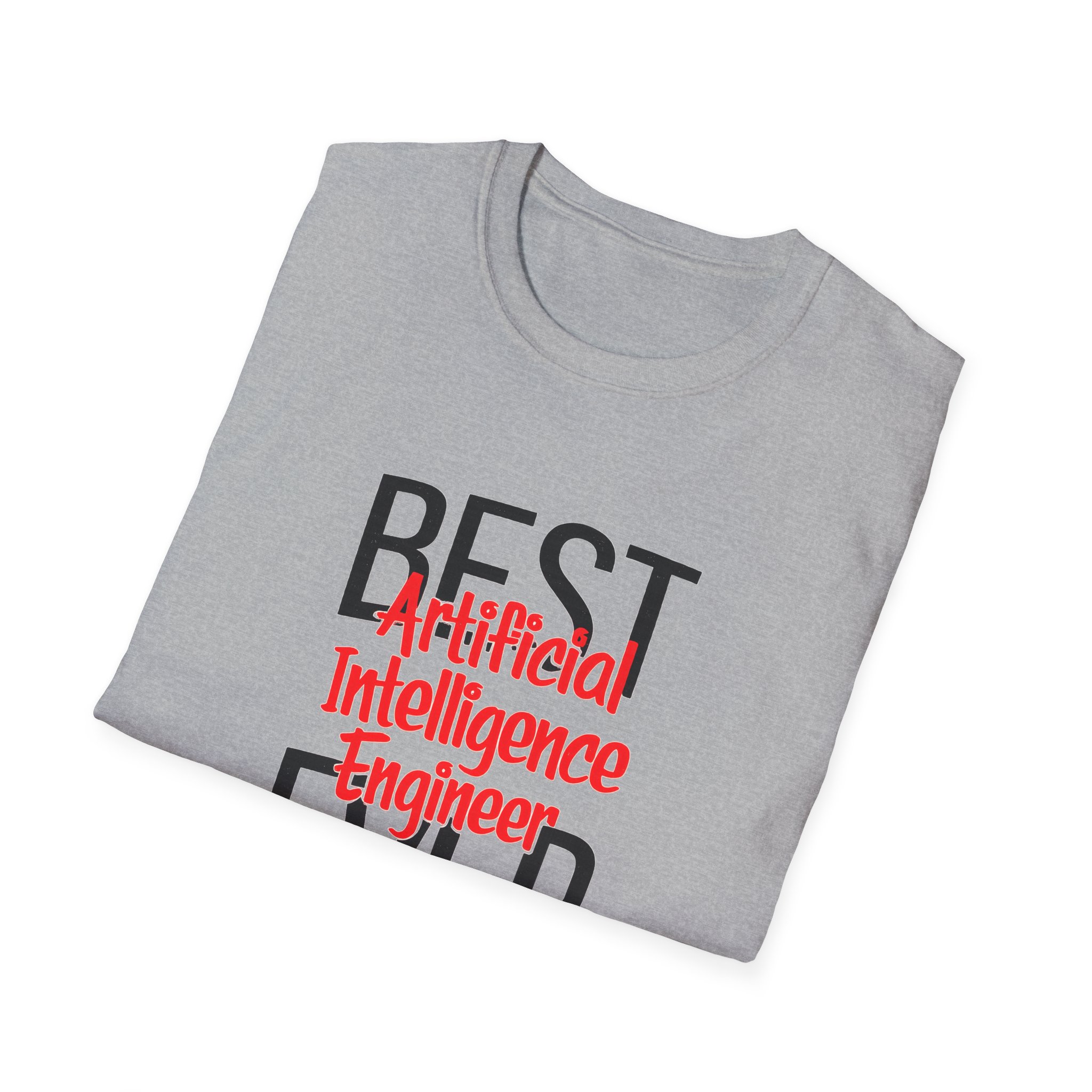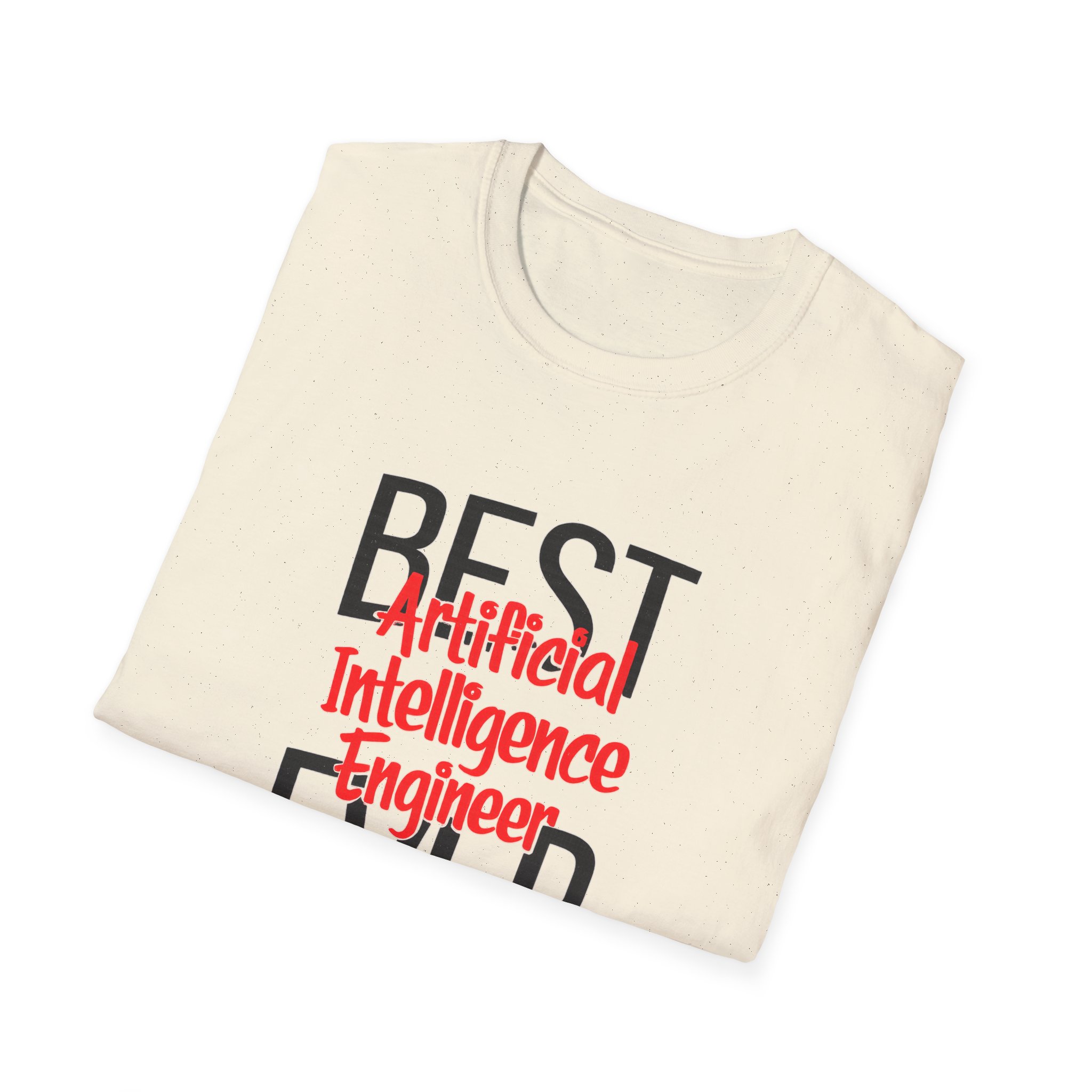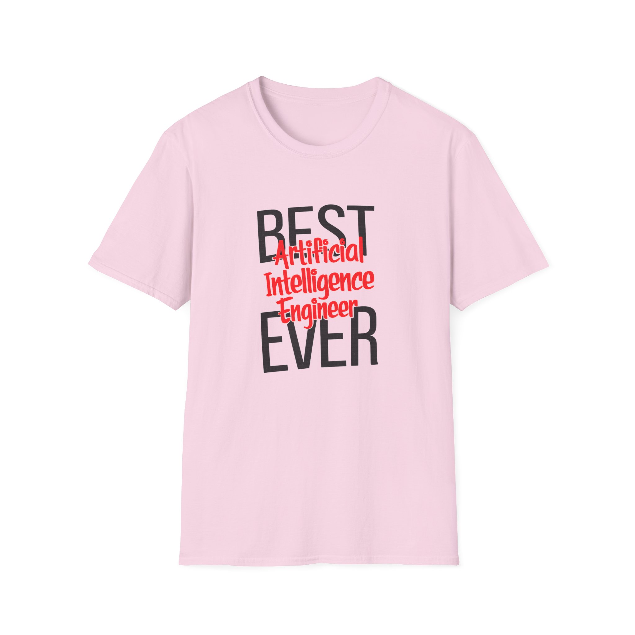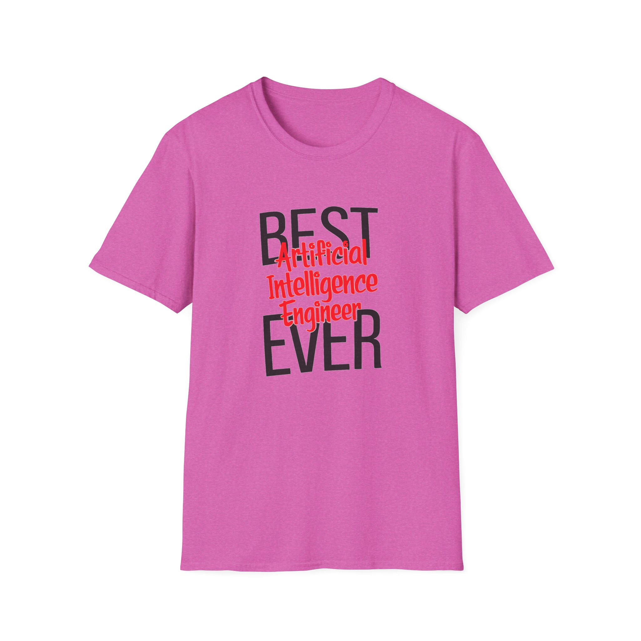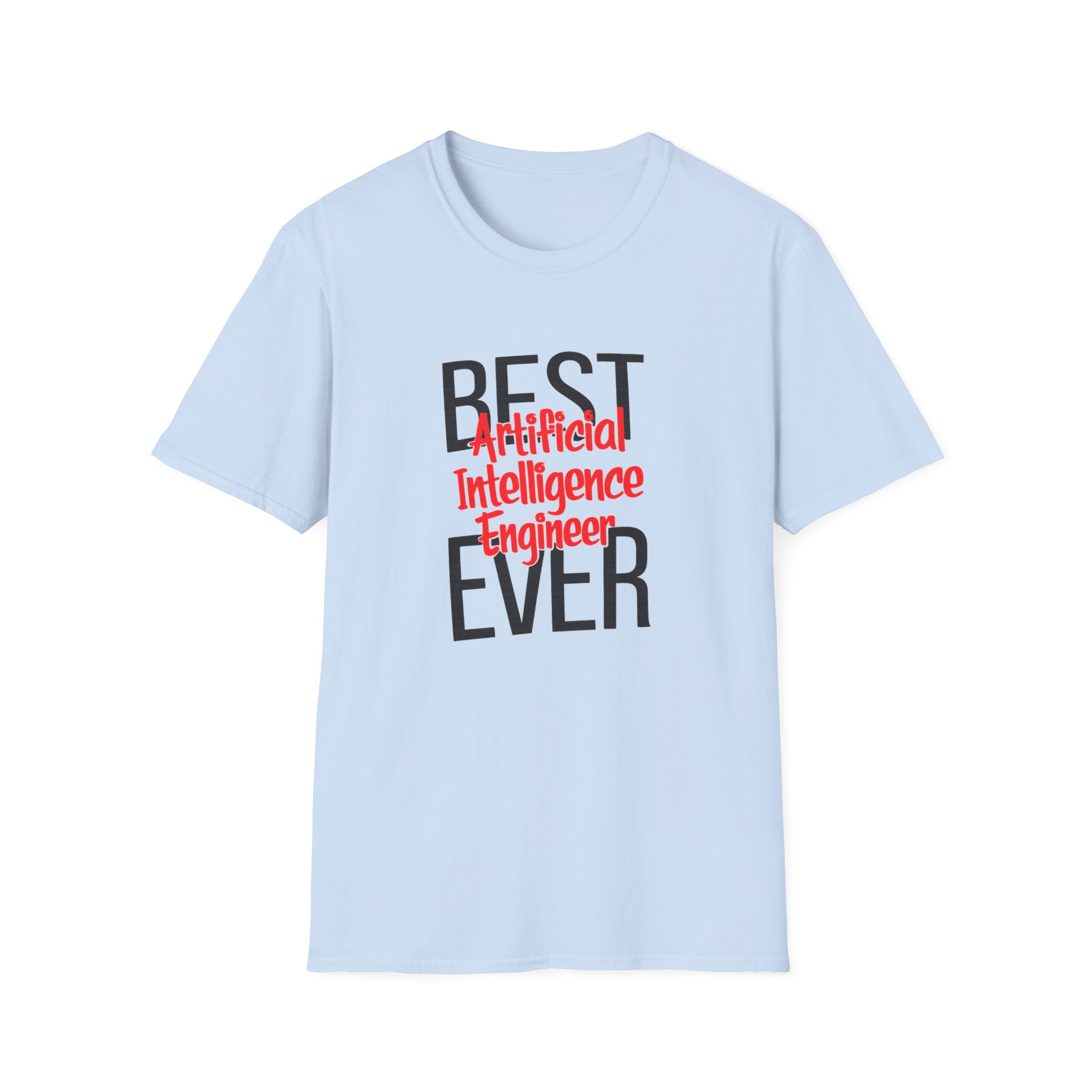 The typography does everything here. “BEST” and “EVER” in oversized distressed gray block letters frame the composition like a monument, while “Artificial Intelligence Engineer” cuts through the center in bold red decorative script — confident, warm, and impossible to miss. Pure black background makes the red pop with the energy of something that means what it says. This isn’t a subtle shirt. It’s a declaration. The kind worn by the person on the team who consistently ships what others said couldn’t be done, and has absolutely stopped pretending to be modest about it.
