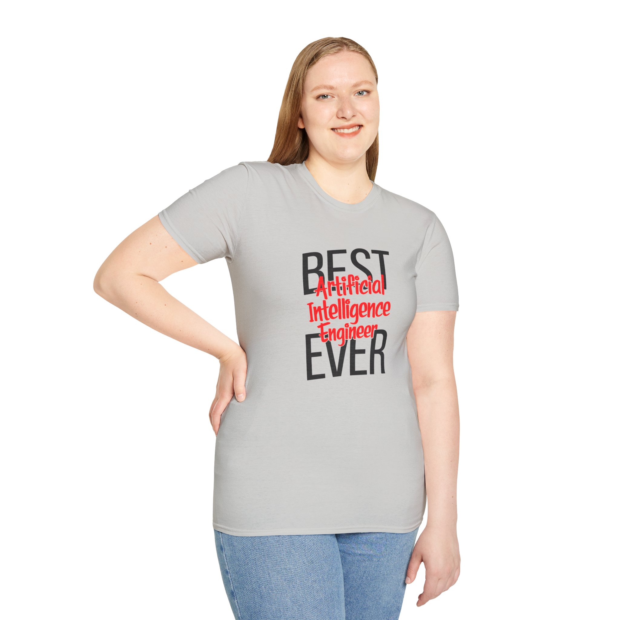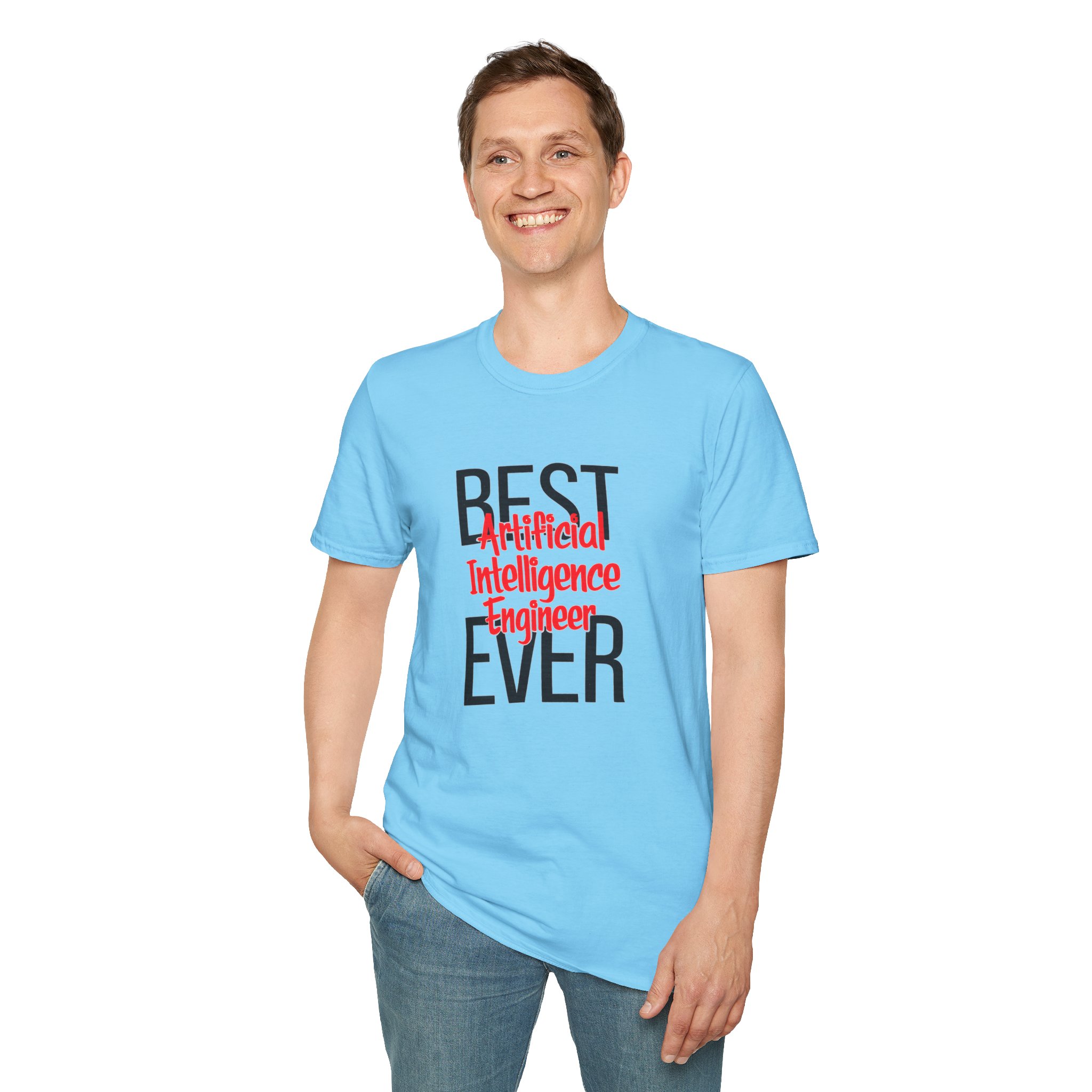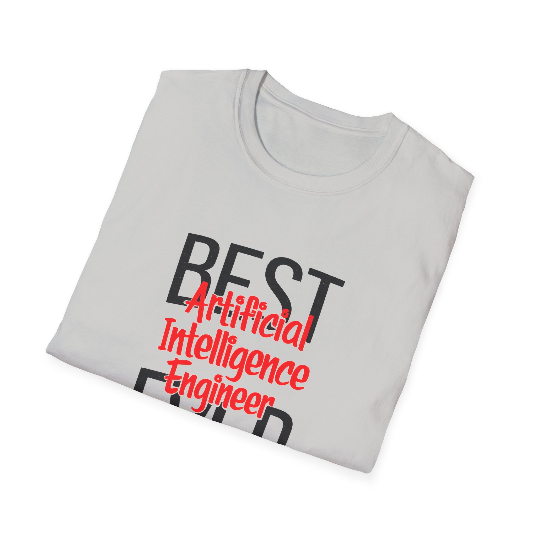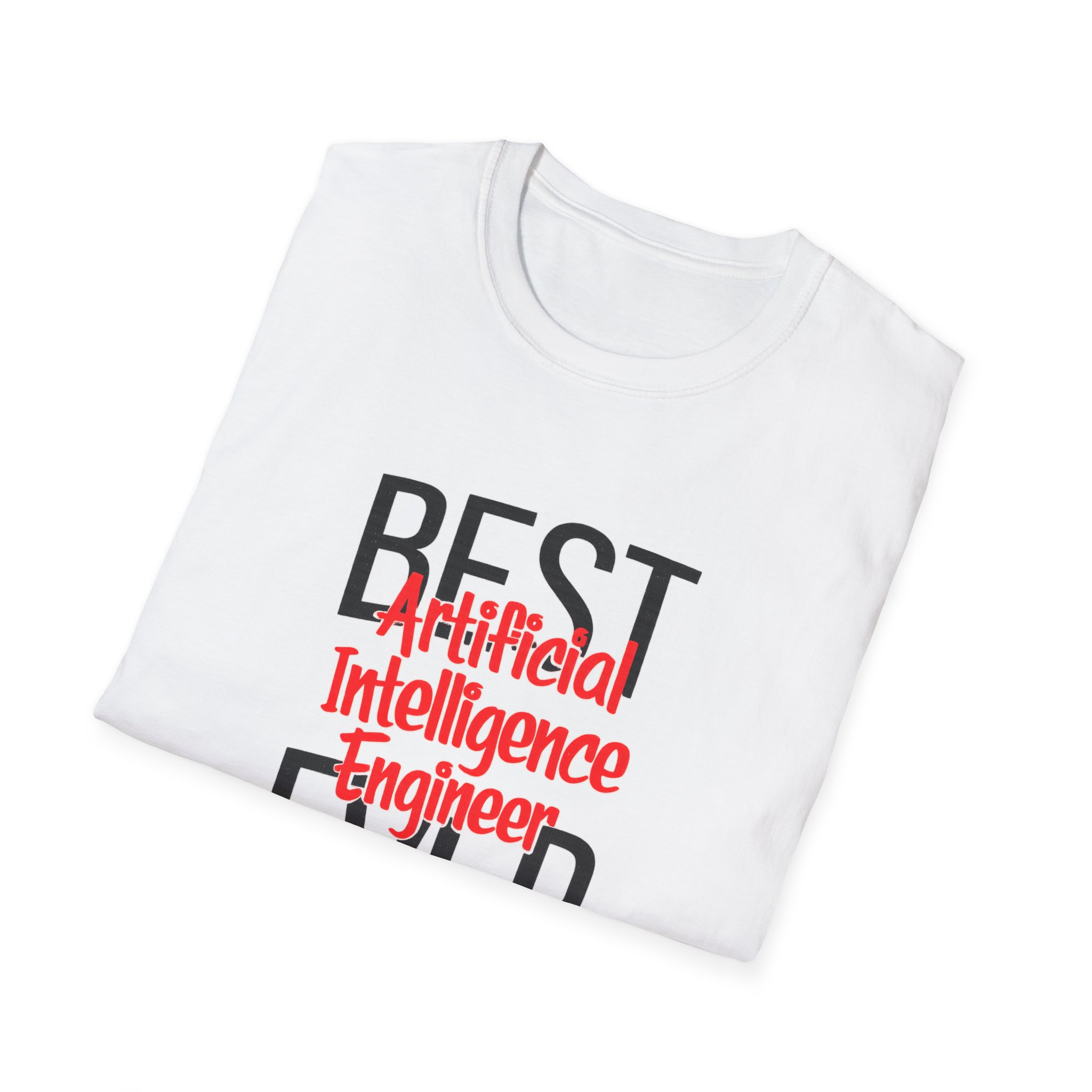 The typography does everything here. “BEST” and “EVER” in oversized distressed gray block letters frame the composition like a monument, while “Artificial Intelligence Engineer” cuts through the center in bold red decorative script — confident, warm, and impossible to miss. Pure black background makes the red pop with the energy of something that means what it says. This isn’t a subtle shirt. It’s a declaration. The kind worn by the person on the team who consistently ships what others said couldn’t be done, and has absolutely stopped pretending to be modest about it.