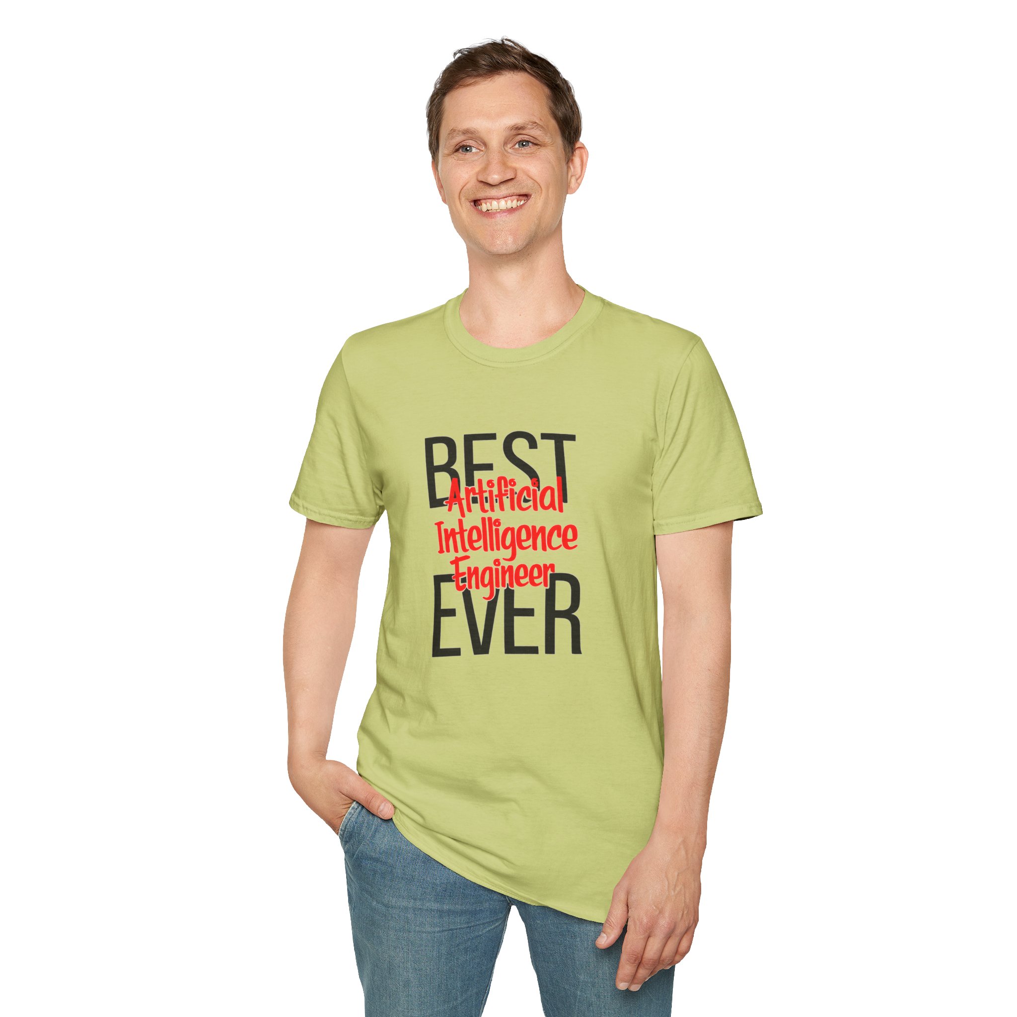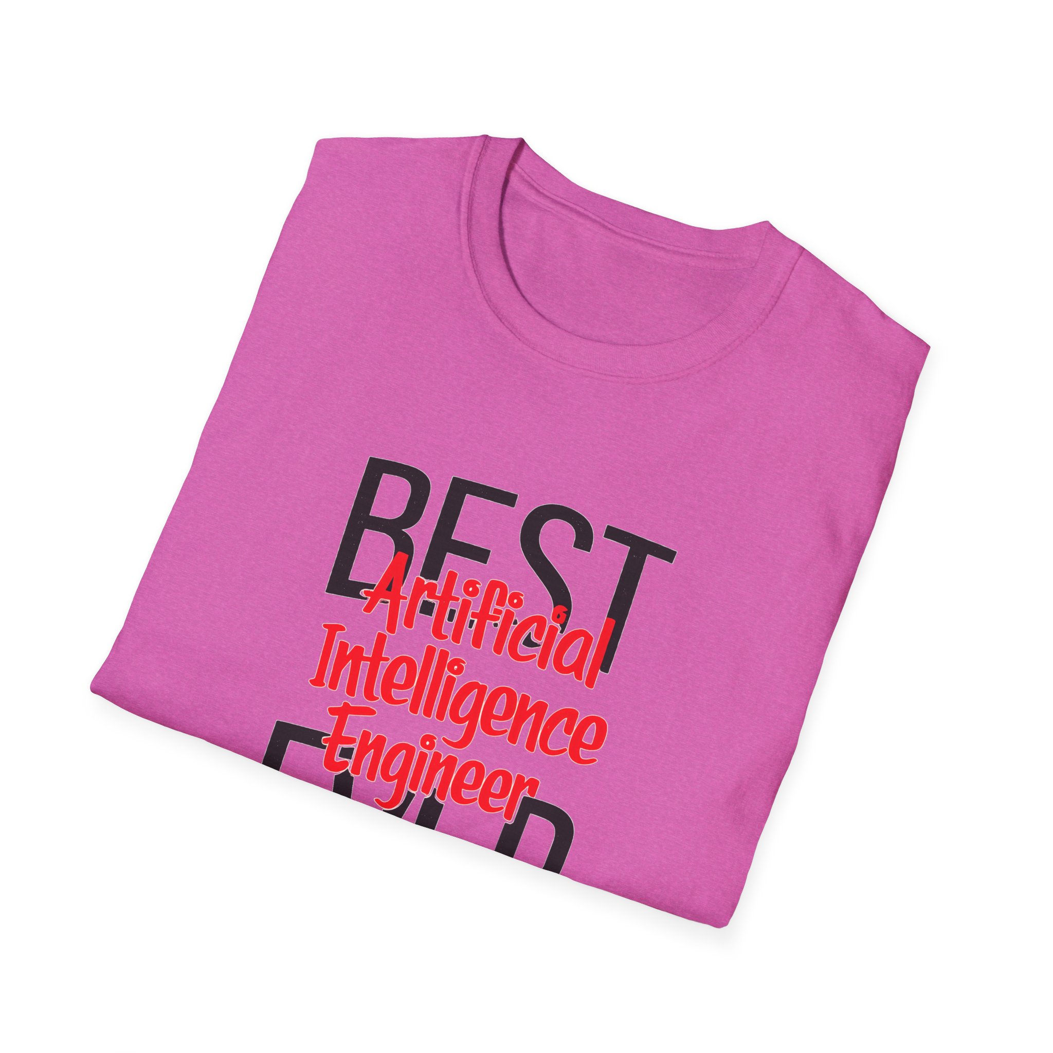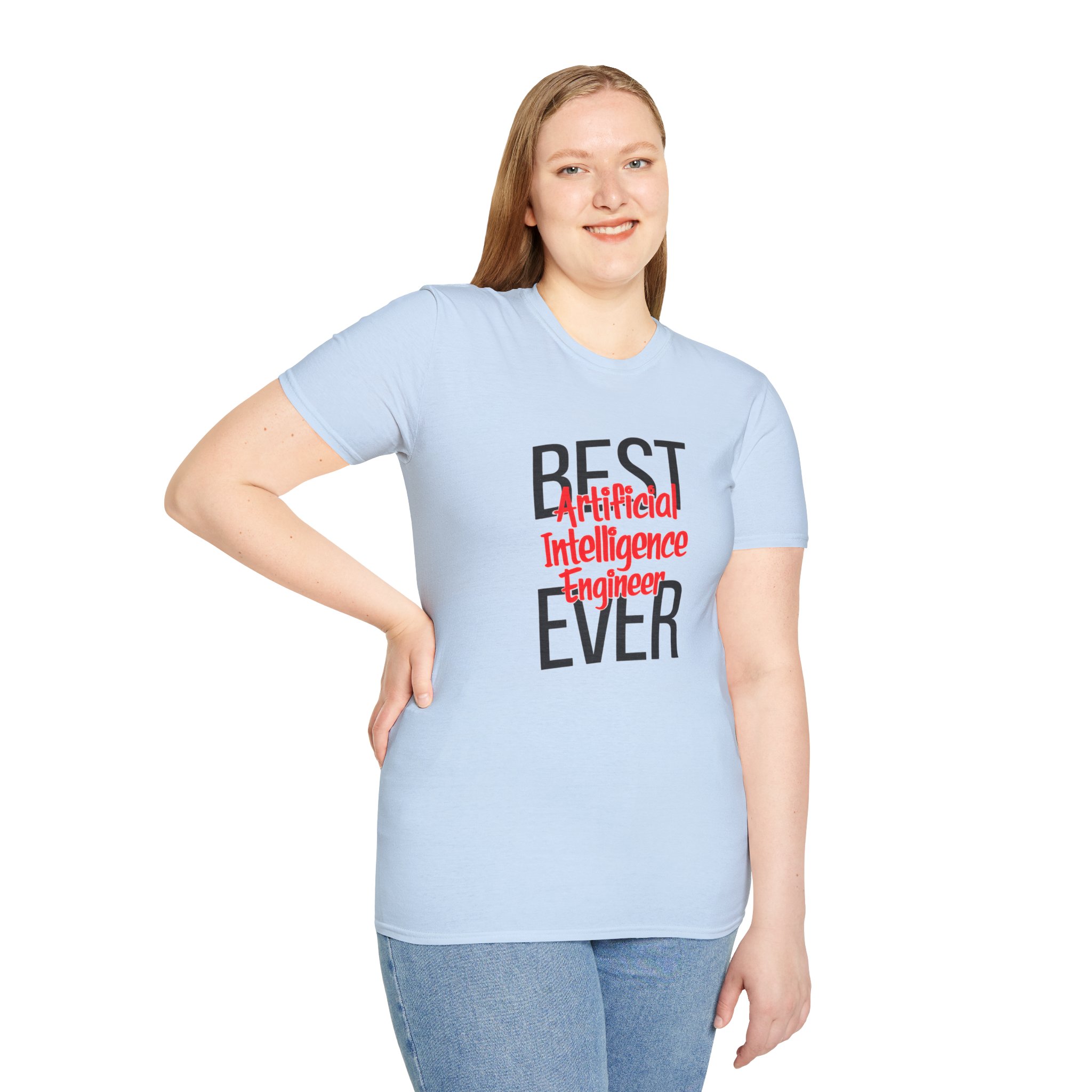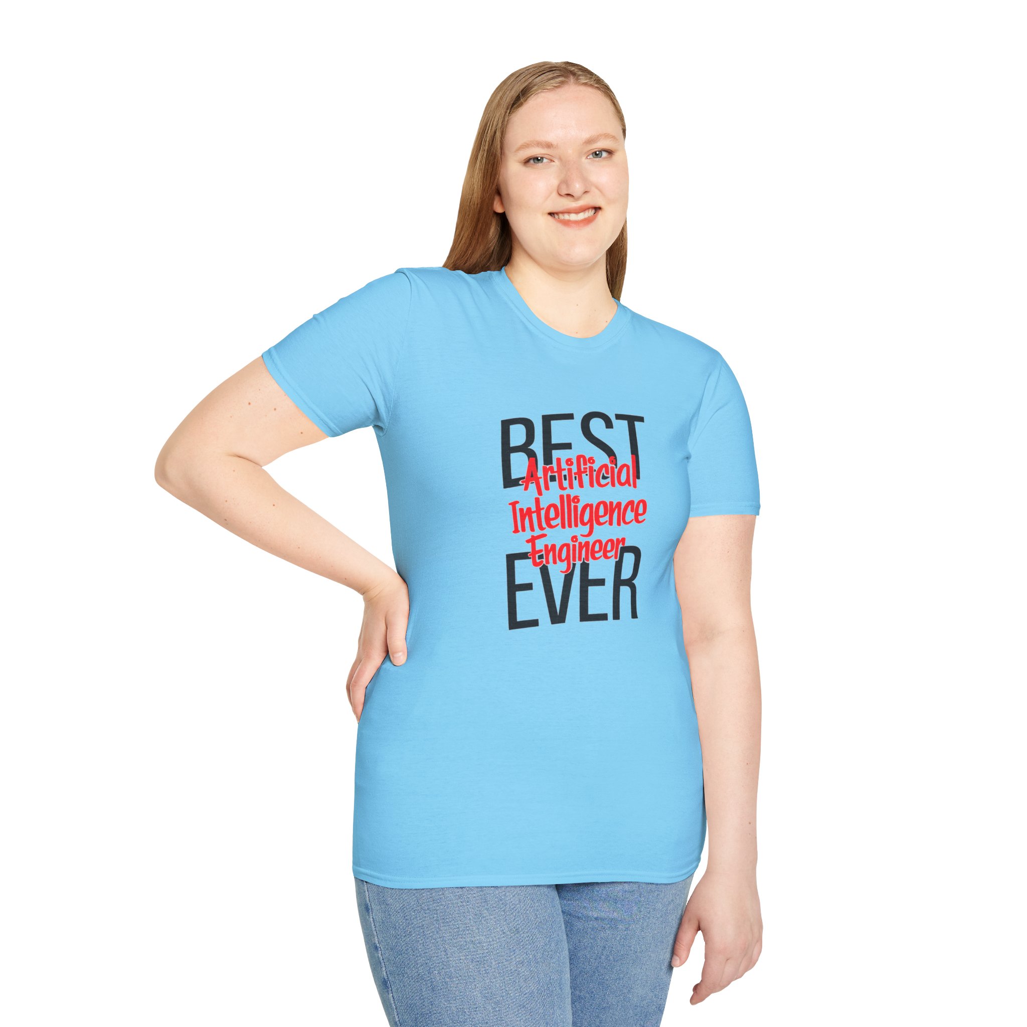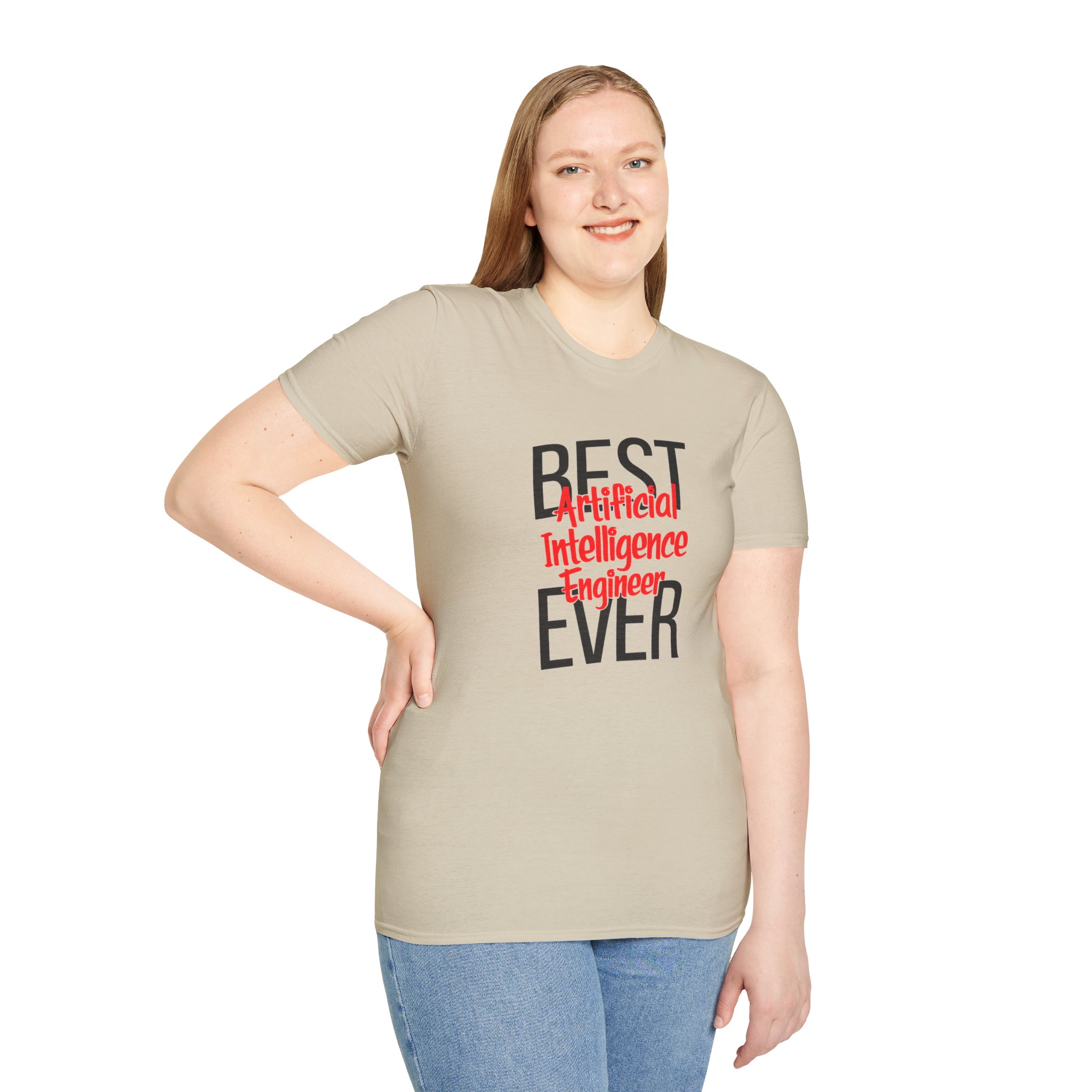 The typography does everything here. “BEST” and “EVER” in oversized distressed gray block letters frame the composition like a monument, while “Artificial Intelligence Engineer” cuts through the center in bold red decorative script — confident, warm, and impossible to miss. Pure black background makes the red pop with the energy of something that means what it says. This isn’t a subtle shirt. It’s a declaration. The kind worn by the person on the team who consistently ships what others said couldn’t be done, and has absolutely stopped pretending to be modest about it.