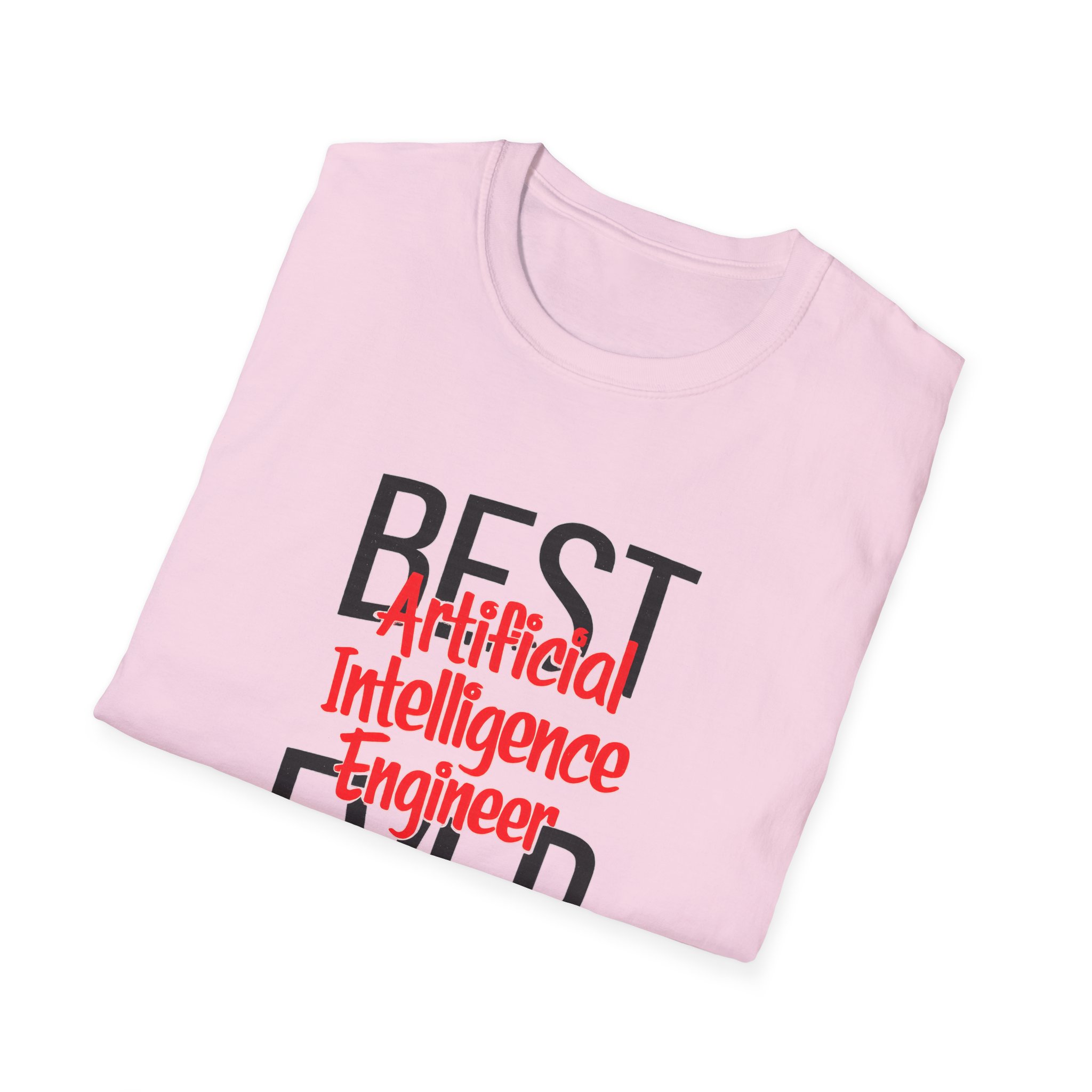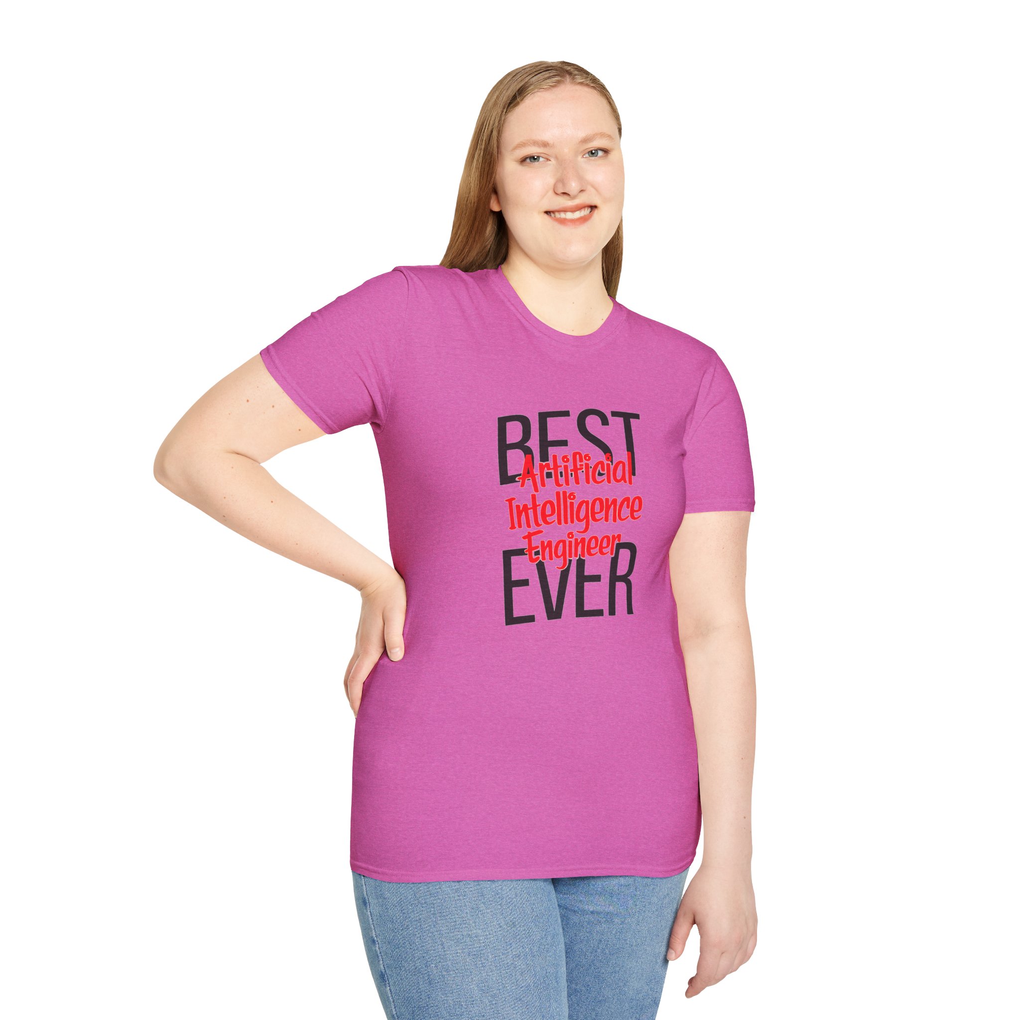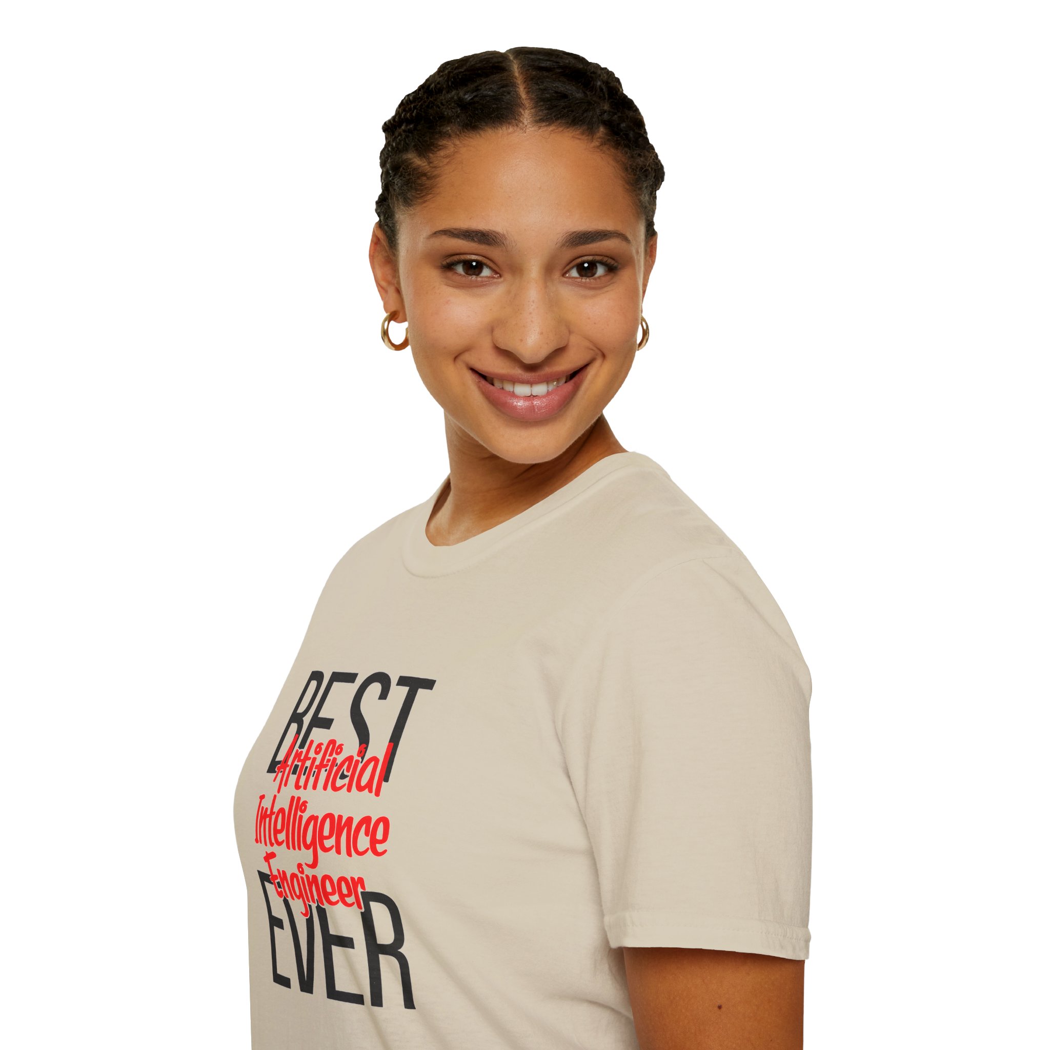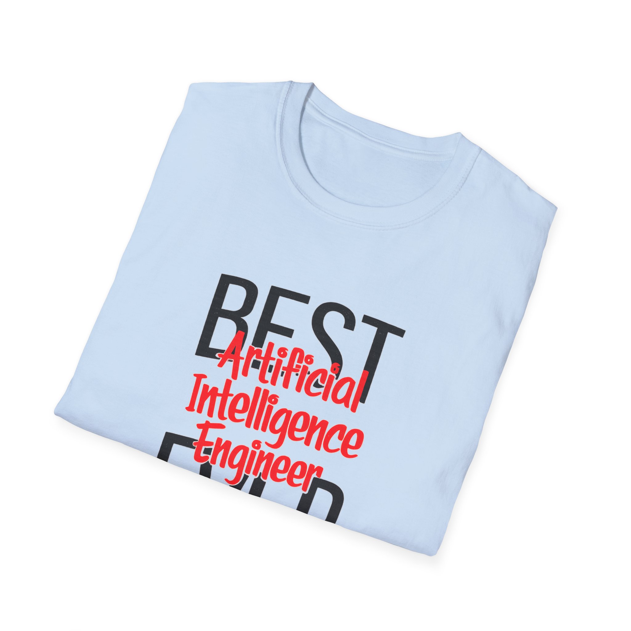 The typography does everything here. “BEST” and “EVER” in oversized distressed gray block letters frame the composition like a monument, while “Artificial Intelligence Engineer” cuts through the center in bold red decorative script — confident, warm, and impossible to miss. Pure black background makes the red pop with the energy of something that means what it says. This isn’t a subtle shirt. It’s a declaration. The kind worn by the person on the team who consistently ships what others said couldn’t be done, and has absolutely stopped pretending to be modest about it.
