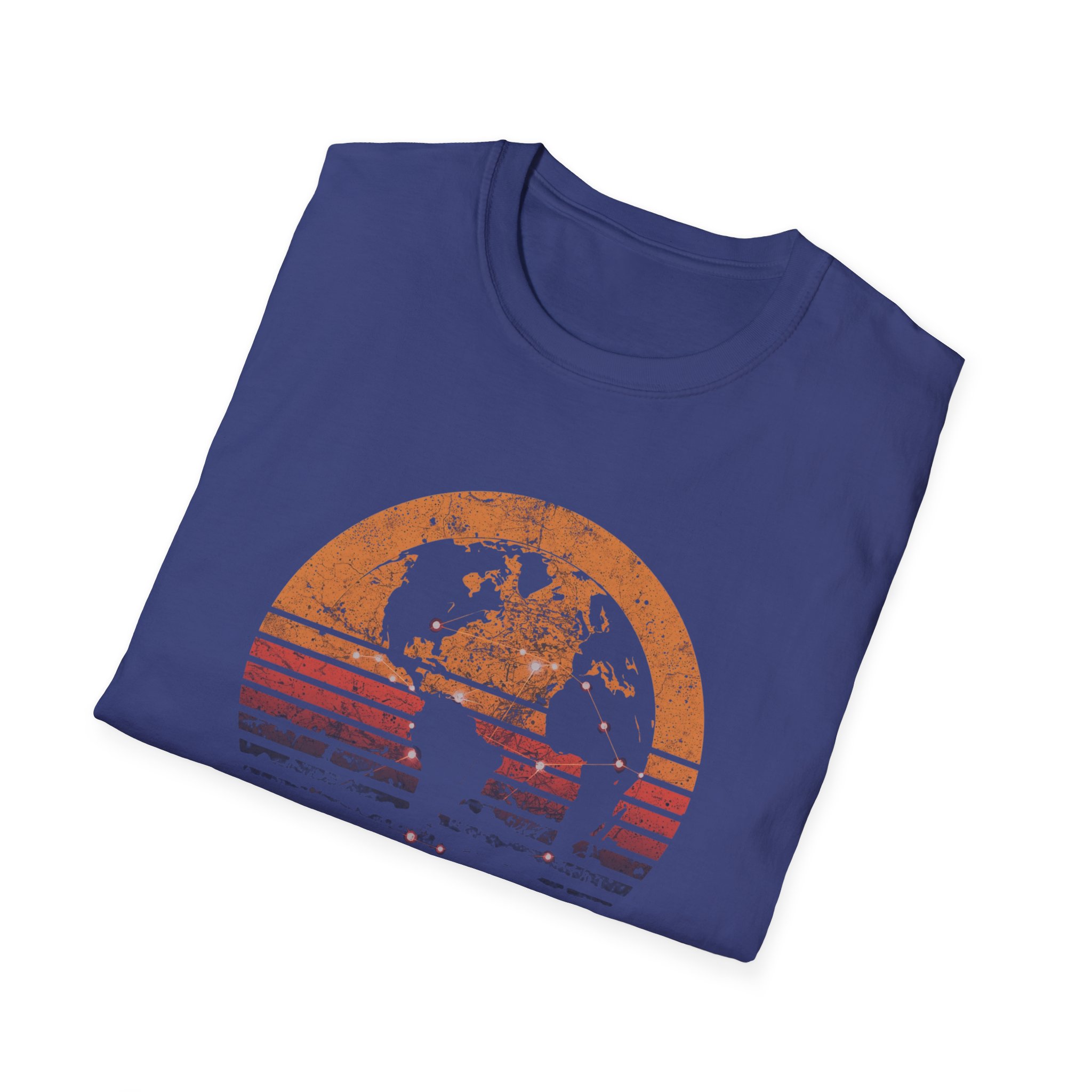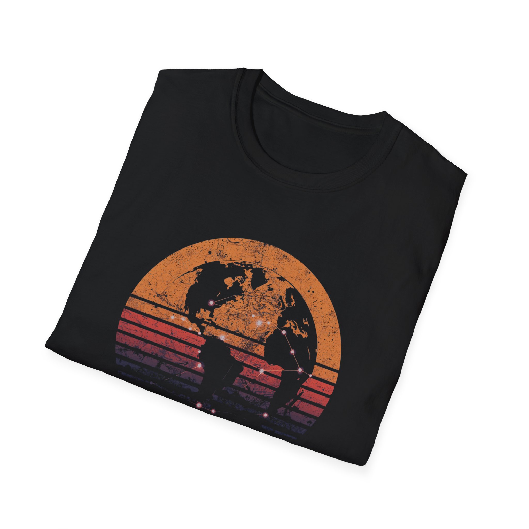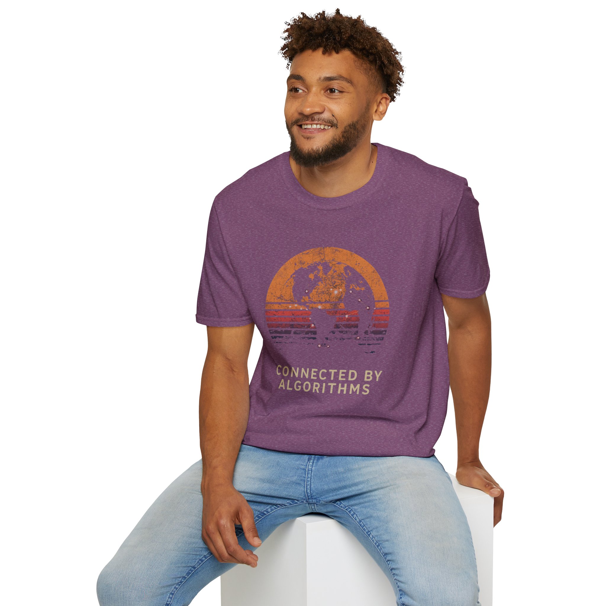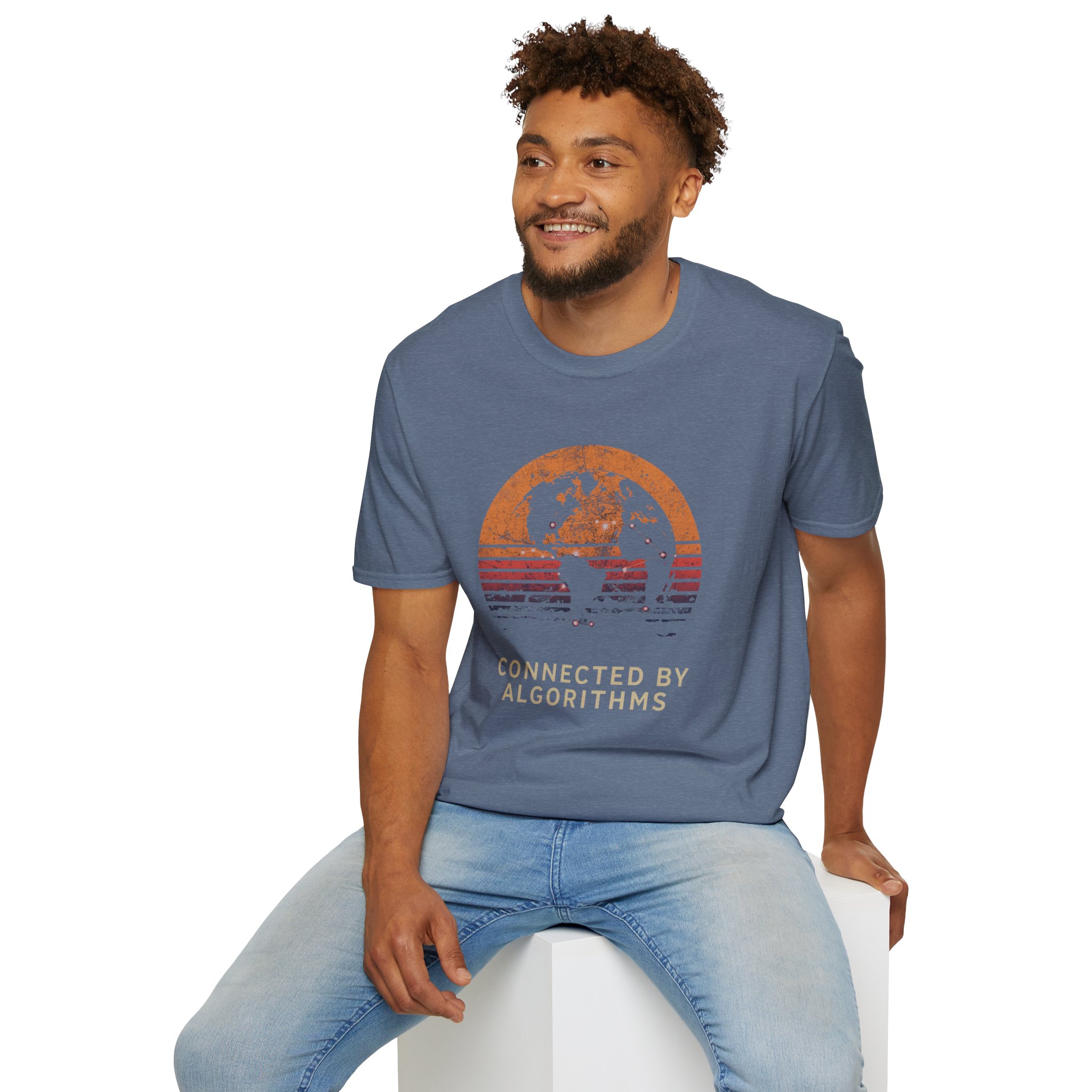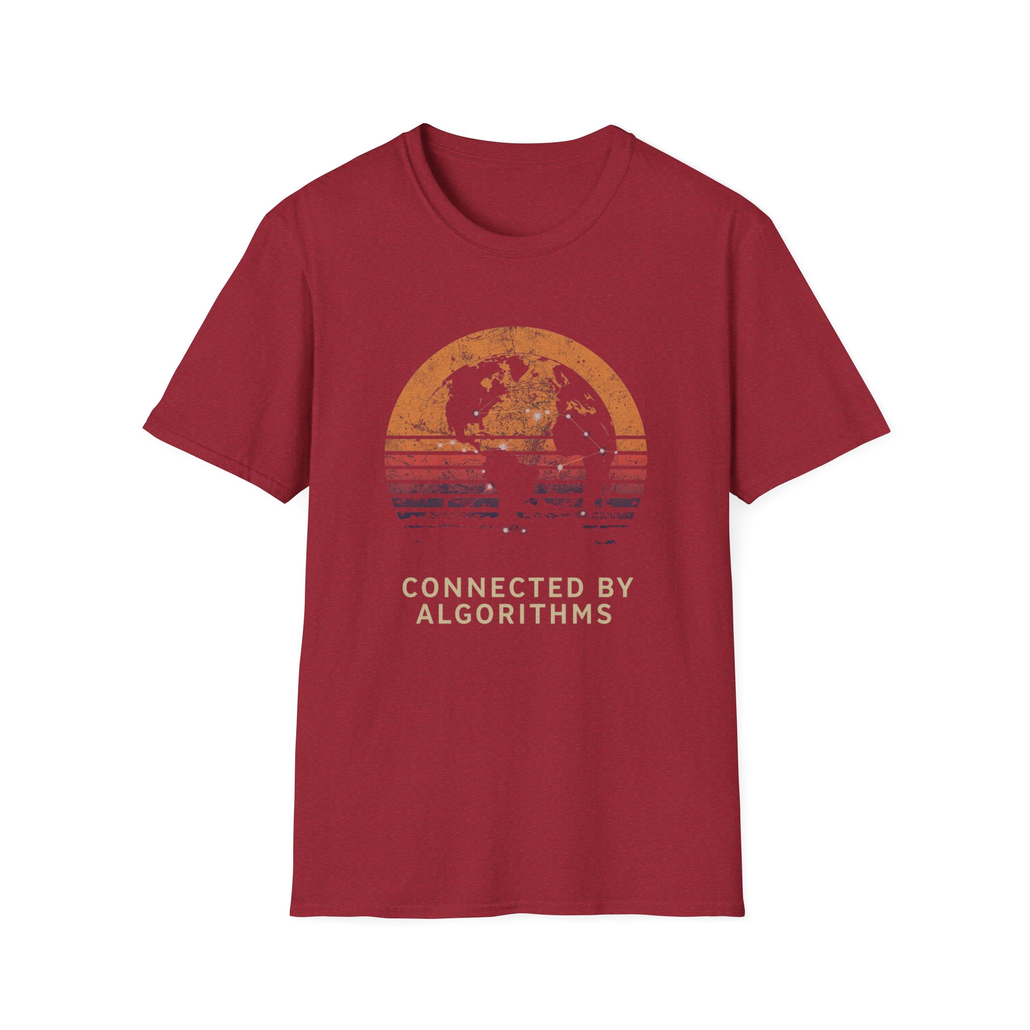 The design is rich, layered and thought-provoking: a dark silhouette of the globe overlaid with glowing network nodes and constellation connection lines — the actual shape of global data infrastructure made visible and beautiful — set against a stunning distressed retro sunset semicircle of amber, burnt orange, coral and deep lavender stripe gradients. The analog texture of the worn, splatter-grain finish gives it the warmth of a vintage travel poster that somehow ended up carrying a profound truth about the 21st century. Below, “CONNECTED BY ALGORITHMS” sits in warm cream block type — matter-of-fact, slightly philosophical, and landing differently depending on who reads it. Equal parts celebration and quiet observation. A shirt that rewards being looked at twice.