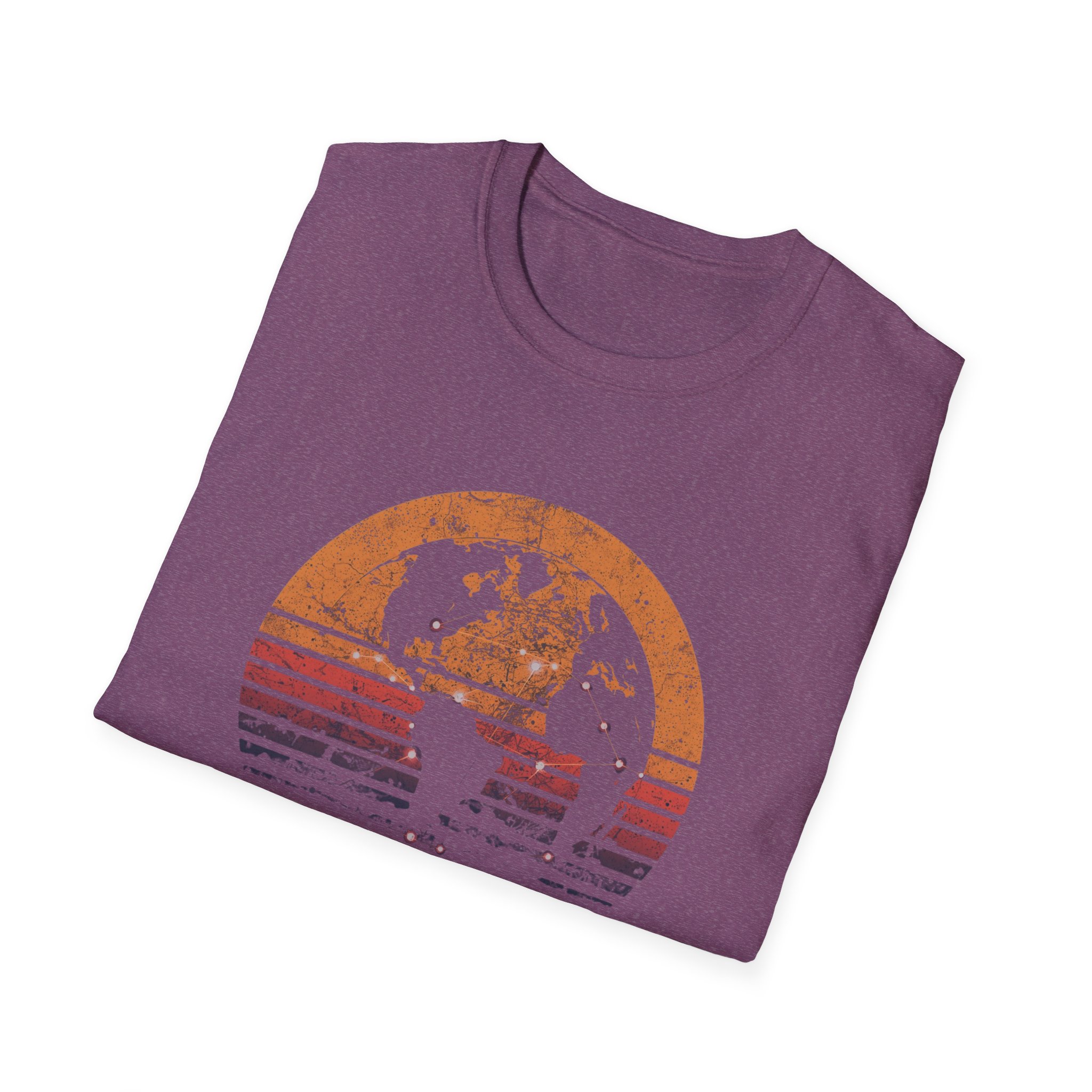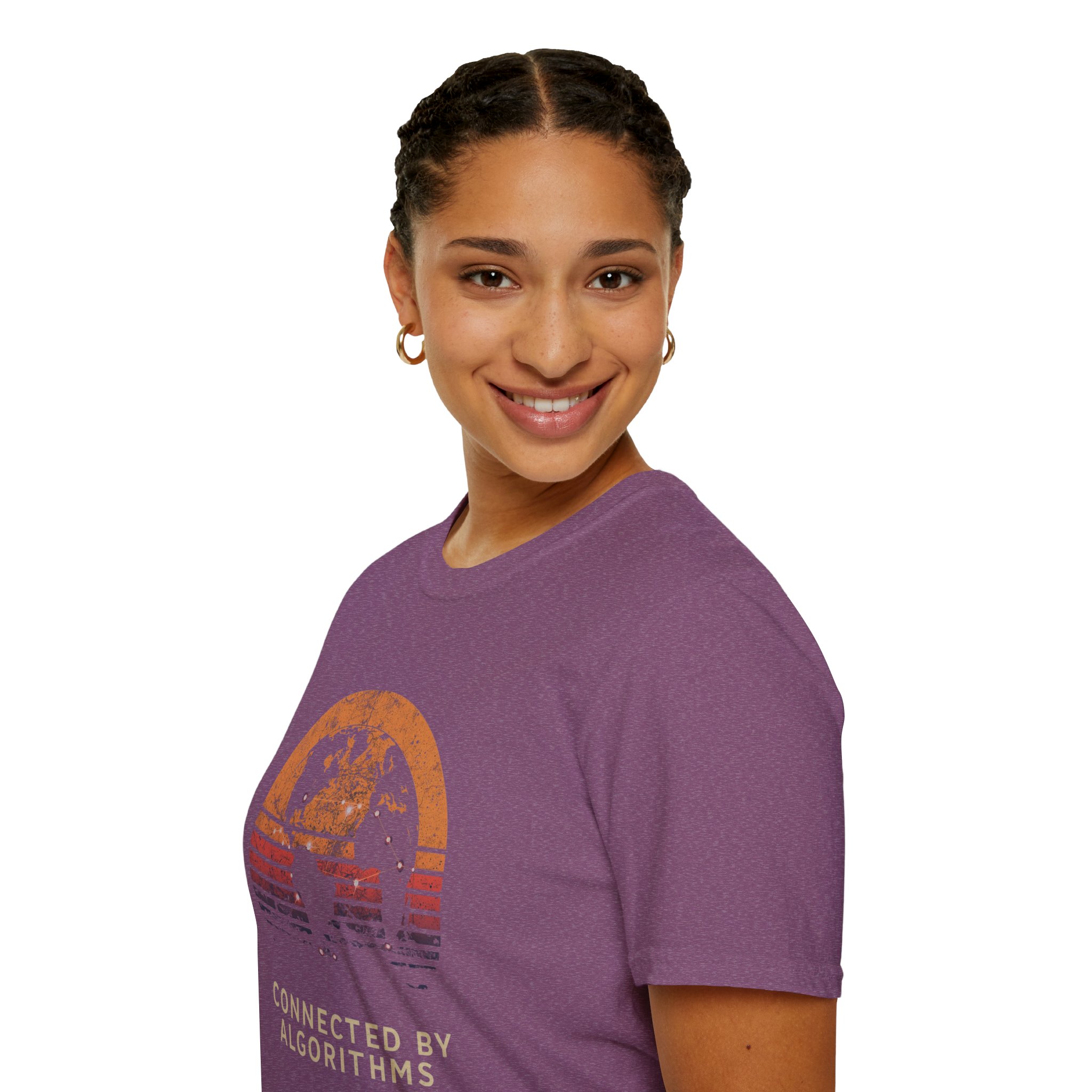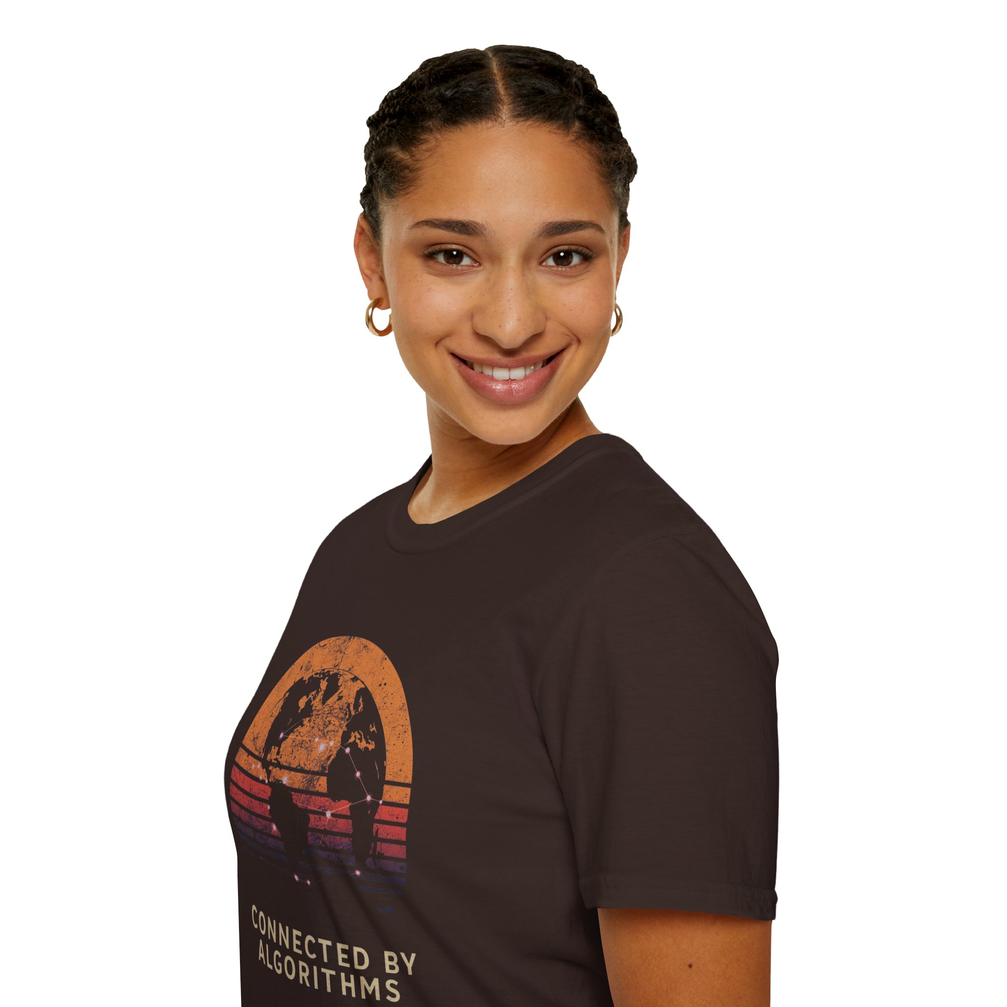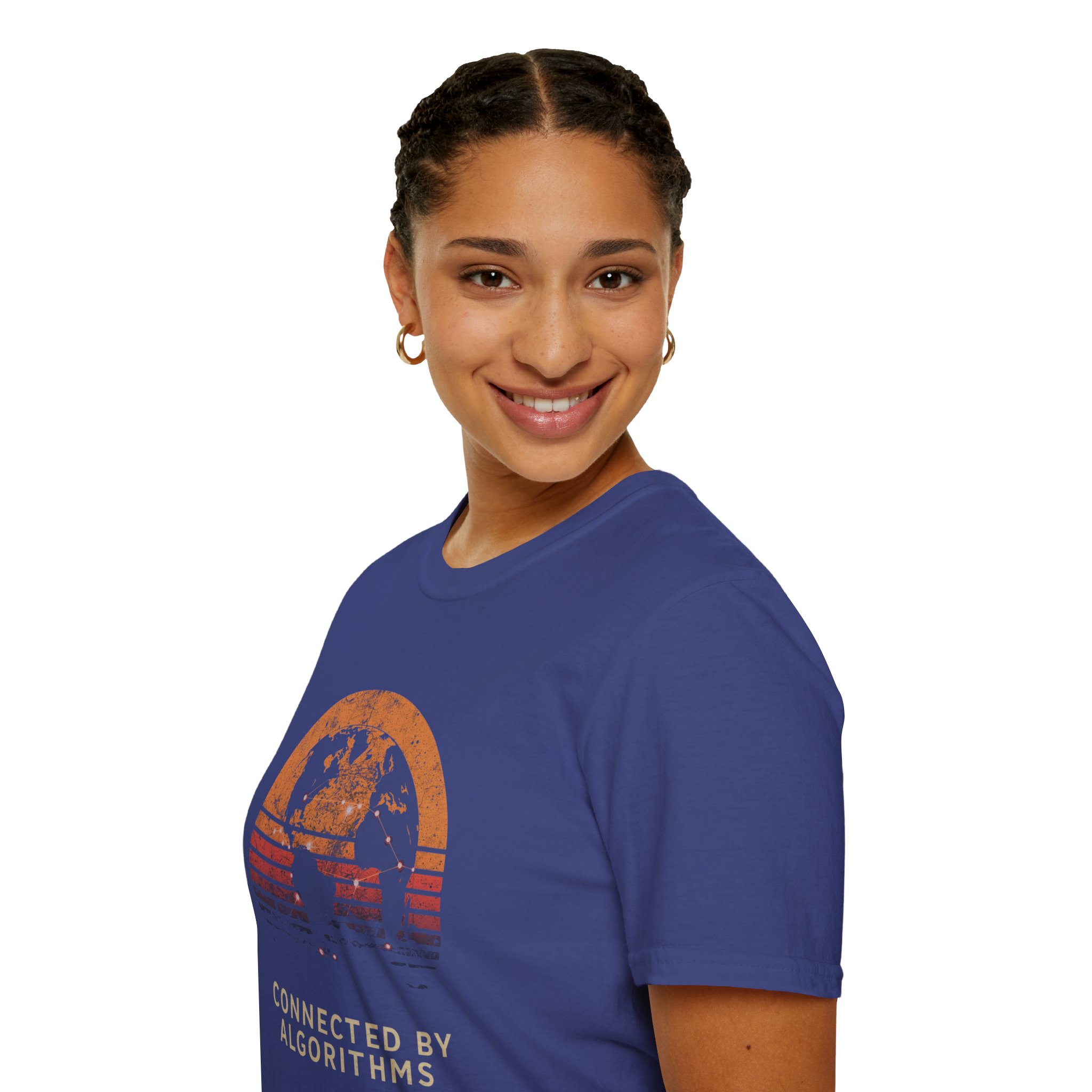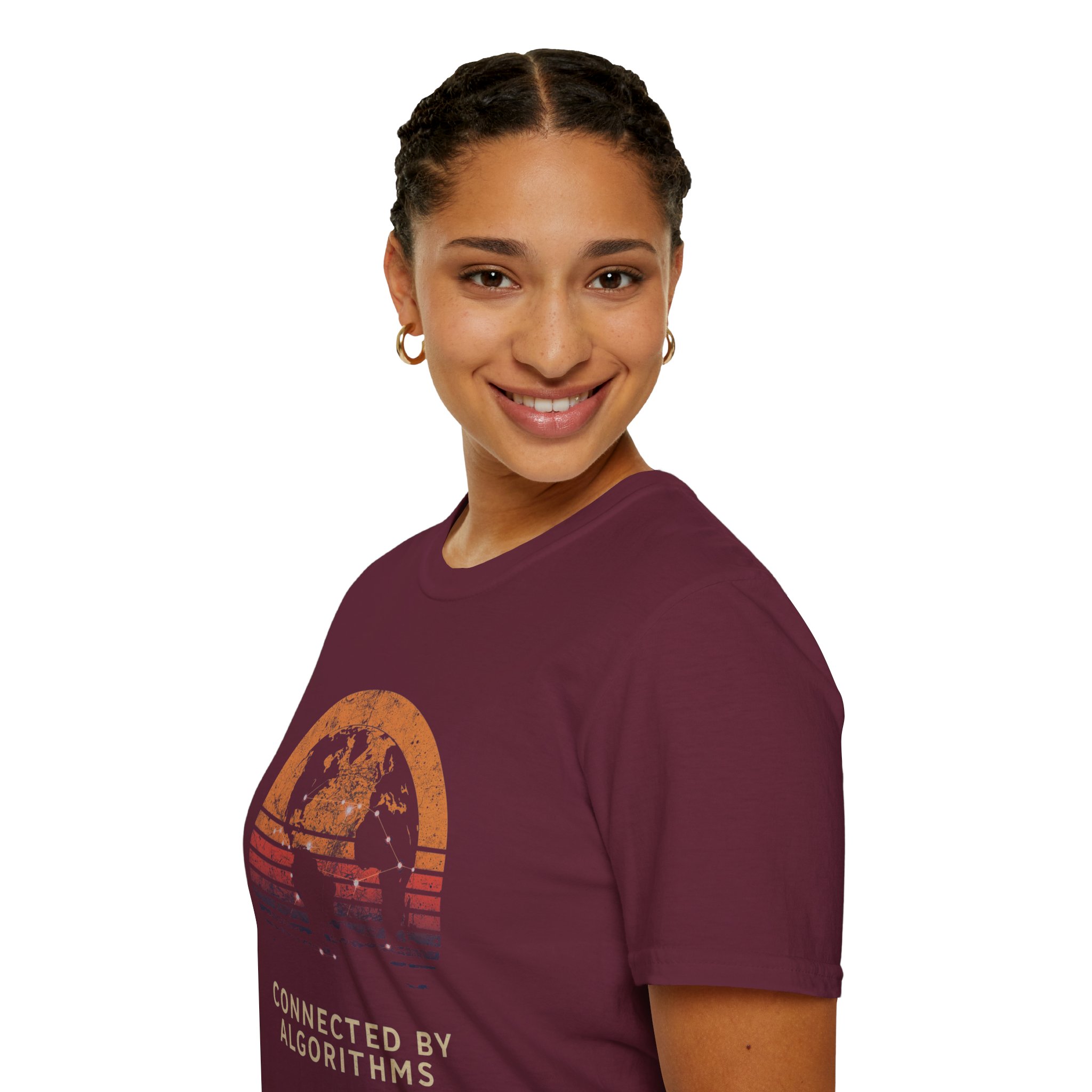 The design is rich, layered and thought-provoking: a dark silhouette of the globe overlaid with glowing network nodes and constellation connection lines — the actual shape of global data infrastructure made visible and beautiful — set against a stunning distressed retro sunset semicircle of amber, burnt orange, coral and deep lavender stripe gradients. The analog texture of the worn, splatter-grain finish gives it the warmth of a vintage travel poster that somehow ended up carrying a profound truth about the 21st century. Below, “CONNECTED BY ALGORITHMS” sits in warm cream block type — matter-of-fact, slightly philosophical, and landing differently depending on who reads it. Equal parts celebration and quiet observation. A shirt that rewards being looked at twice.