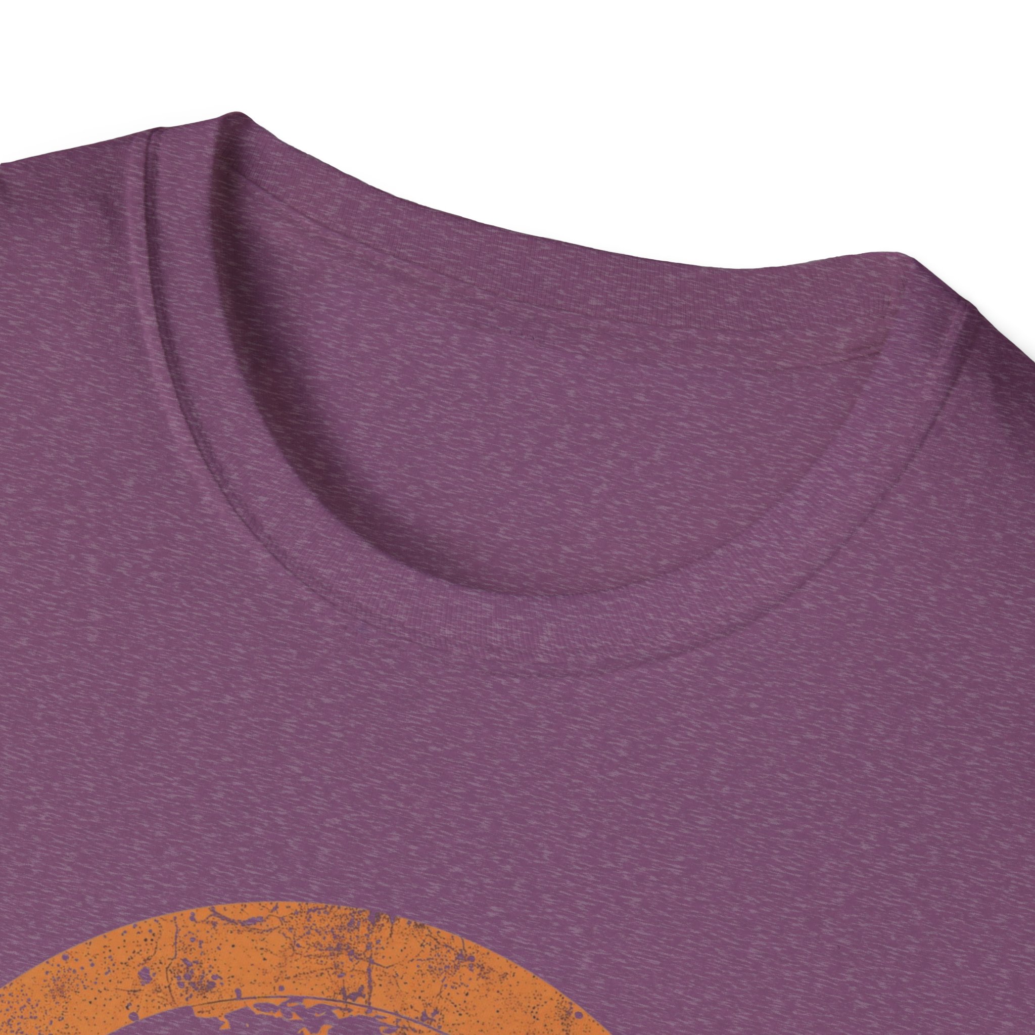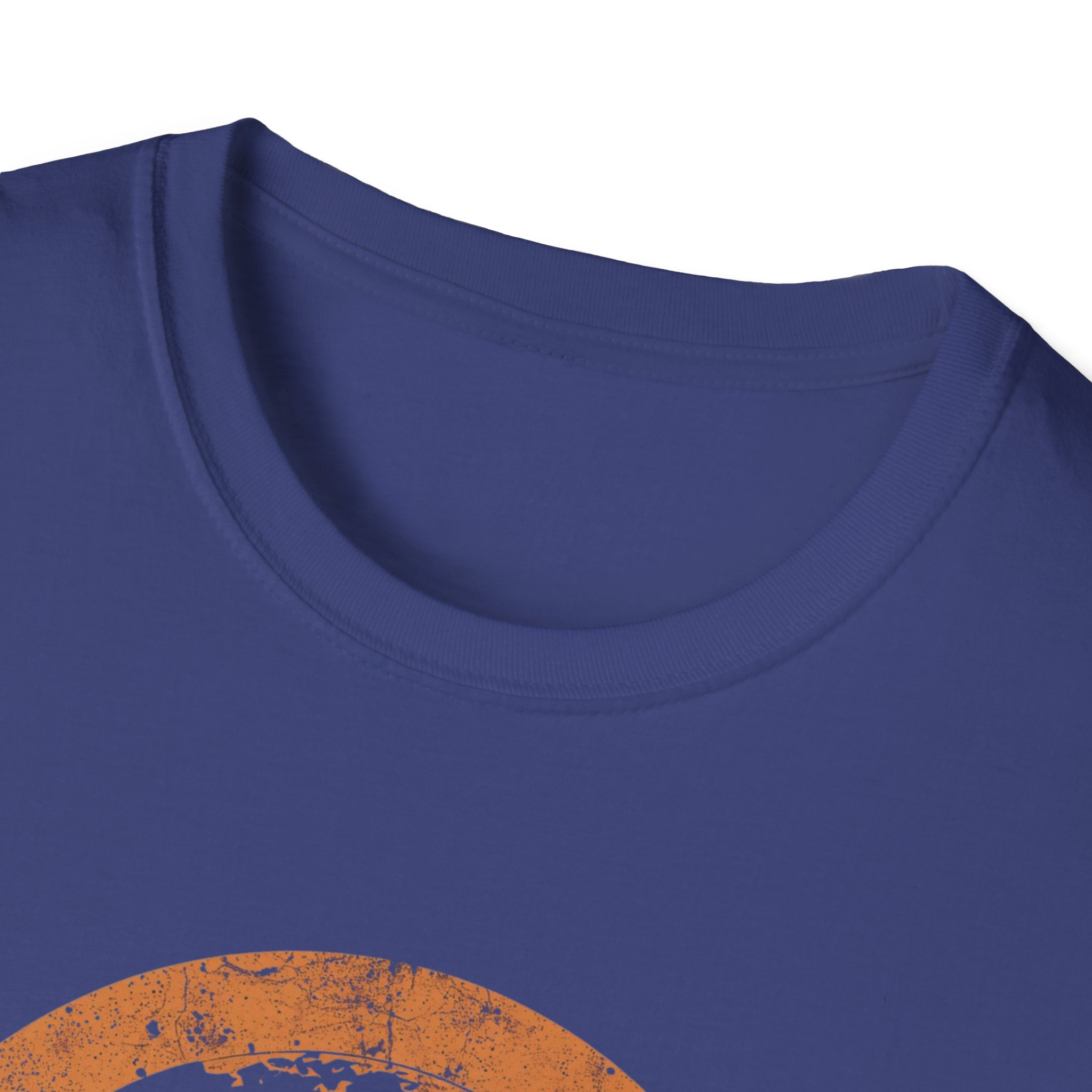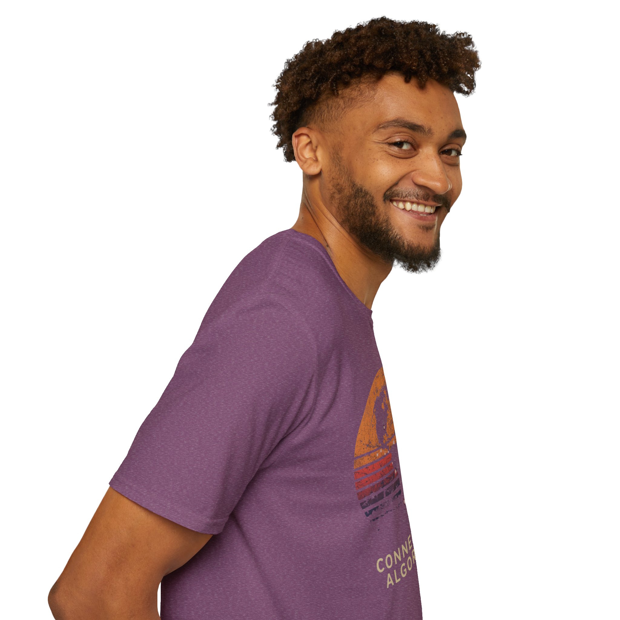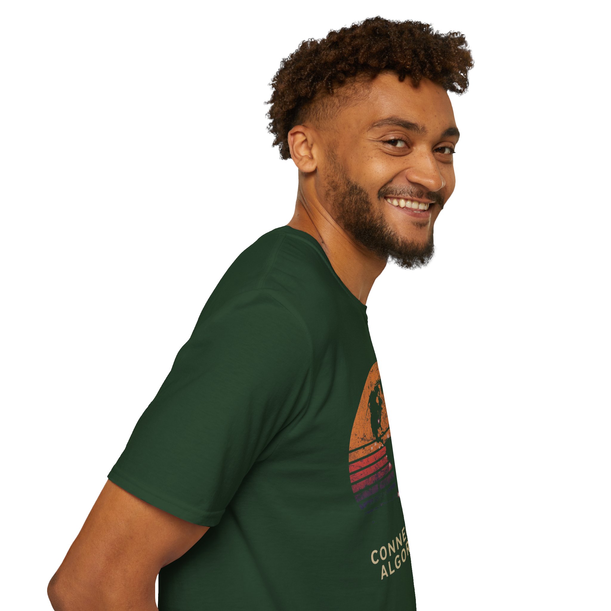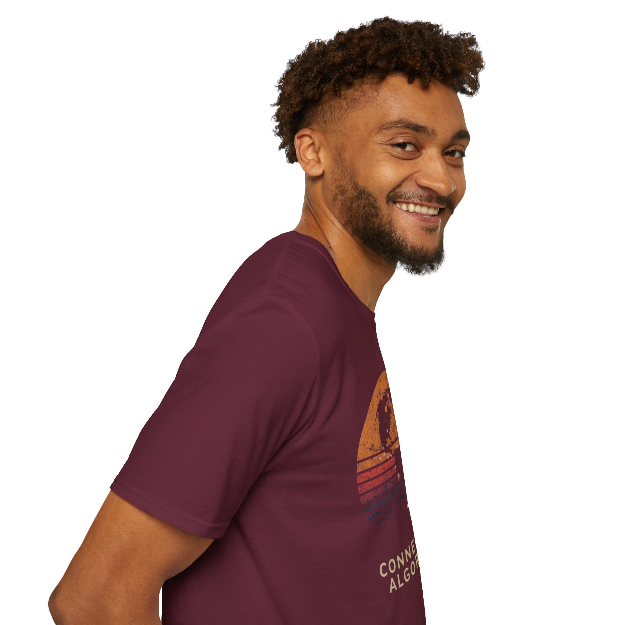 The design is rich, layered and thought-provoking: a dark silhouette of the globe overlaid with glowing network nodes and constellation connection lines — the actual shape of global data infrastructure made visible and beautiful — set against a stunning distressed retro sunset semicircle of amber, burnt orange, coral and deep lavender stripe gradients. The analog texture of the worn, splatter-grain finish gives it the warmth of a vintage travel poster that somehow ended up carrying a profound truth about the 21st century. Below, “CONNECTED BY ALGORITHMS” sits in warm cream block type — matter-of-fact, slightly philosophical, and landing differently depending on who reads it. Equal parts celebration and quiet observation. A shirt that rewards being looked at twice.