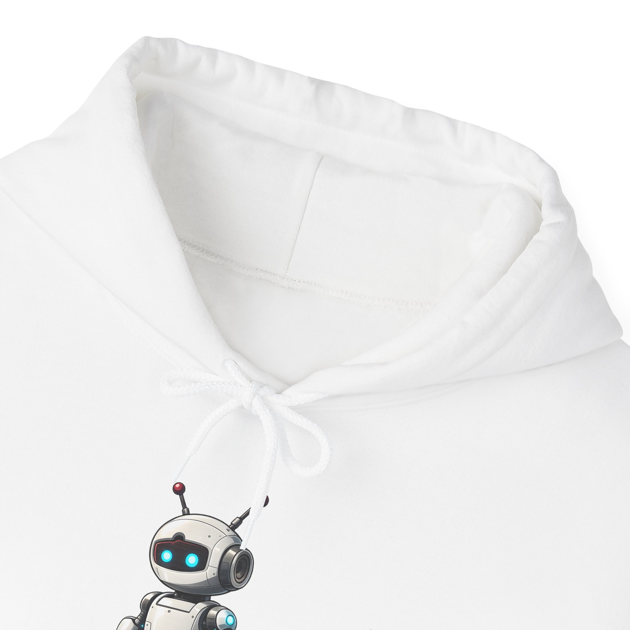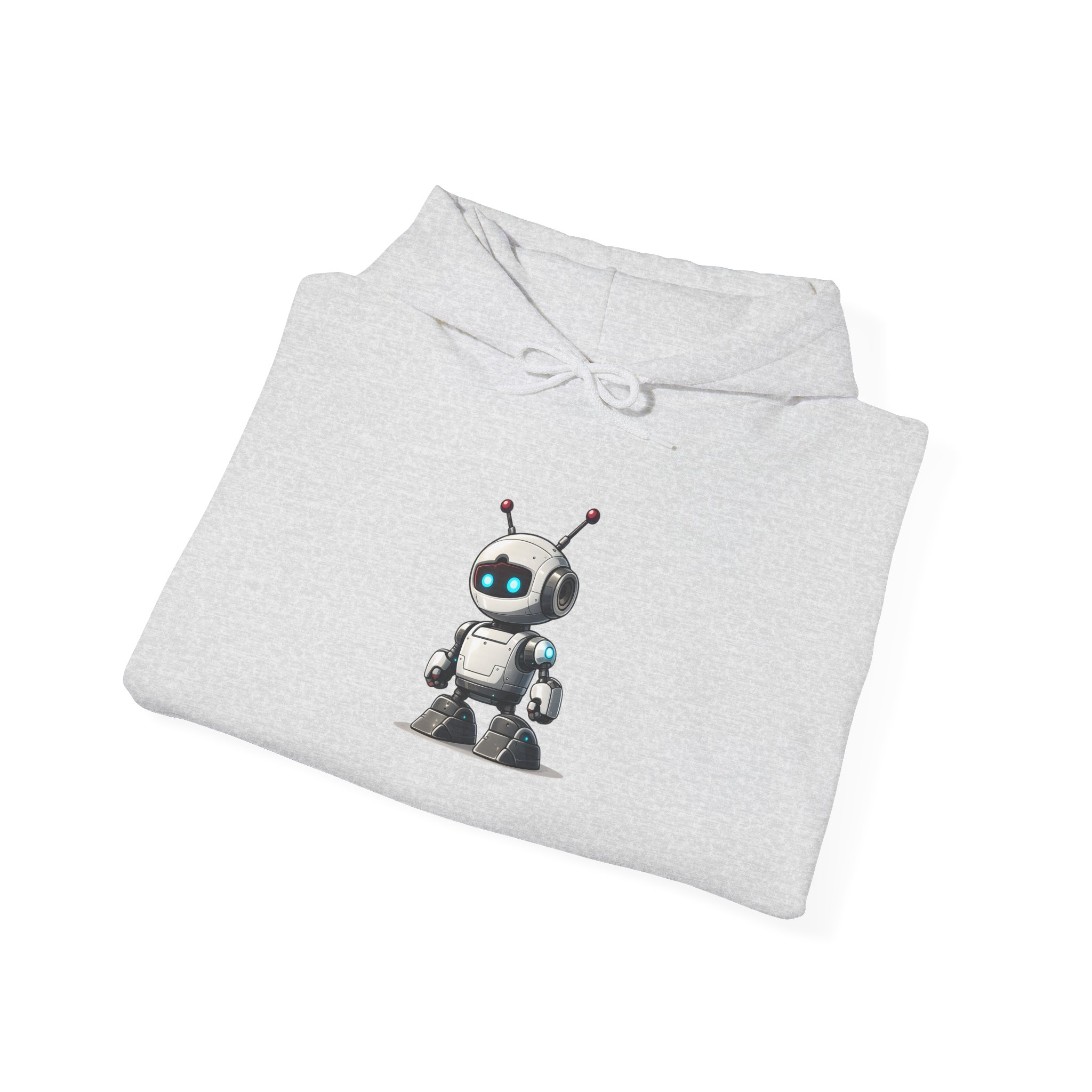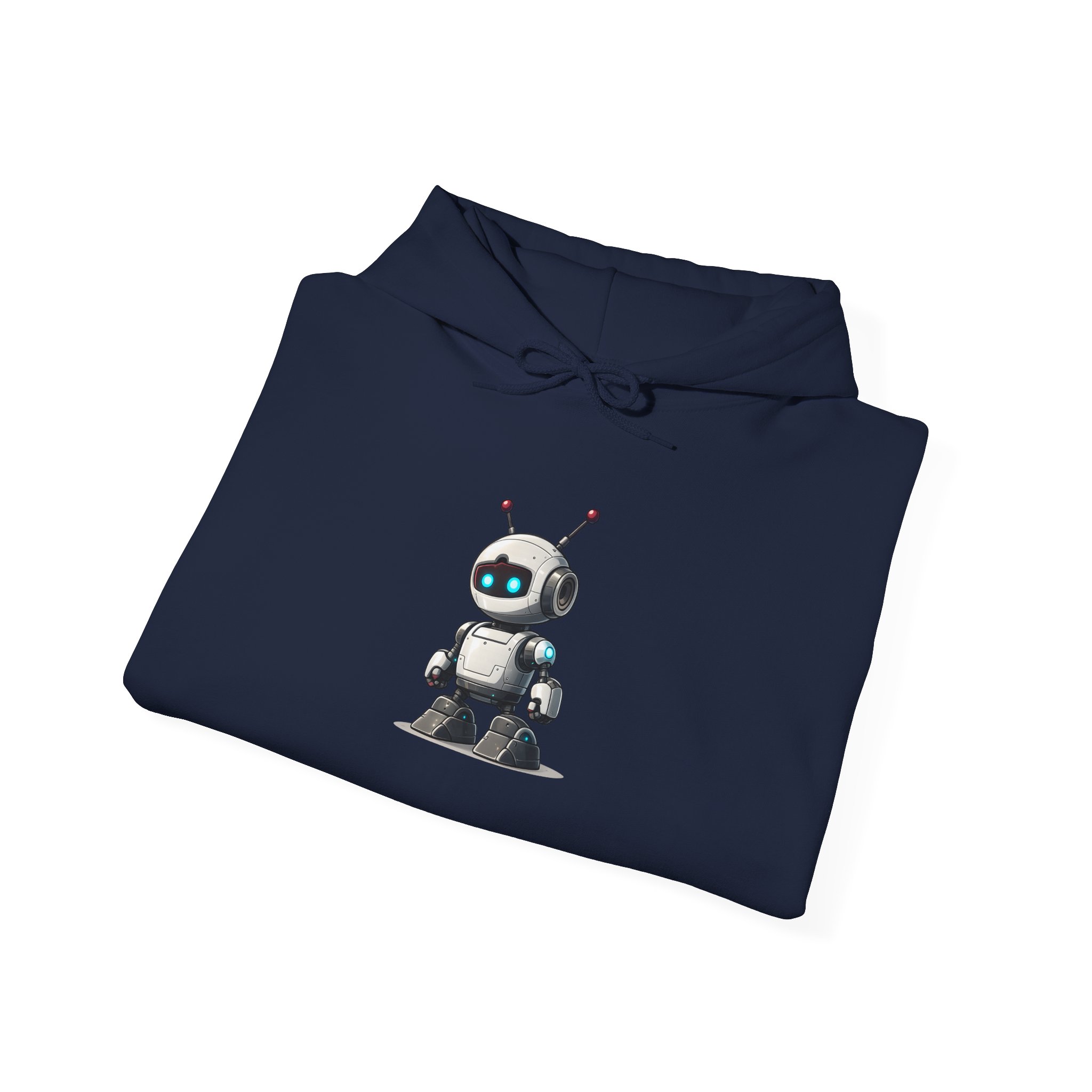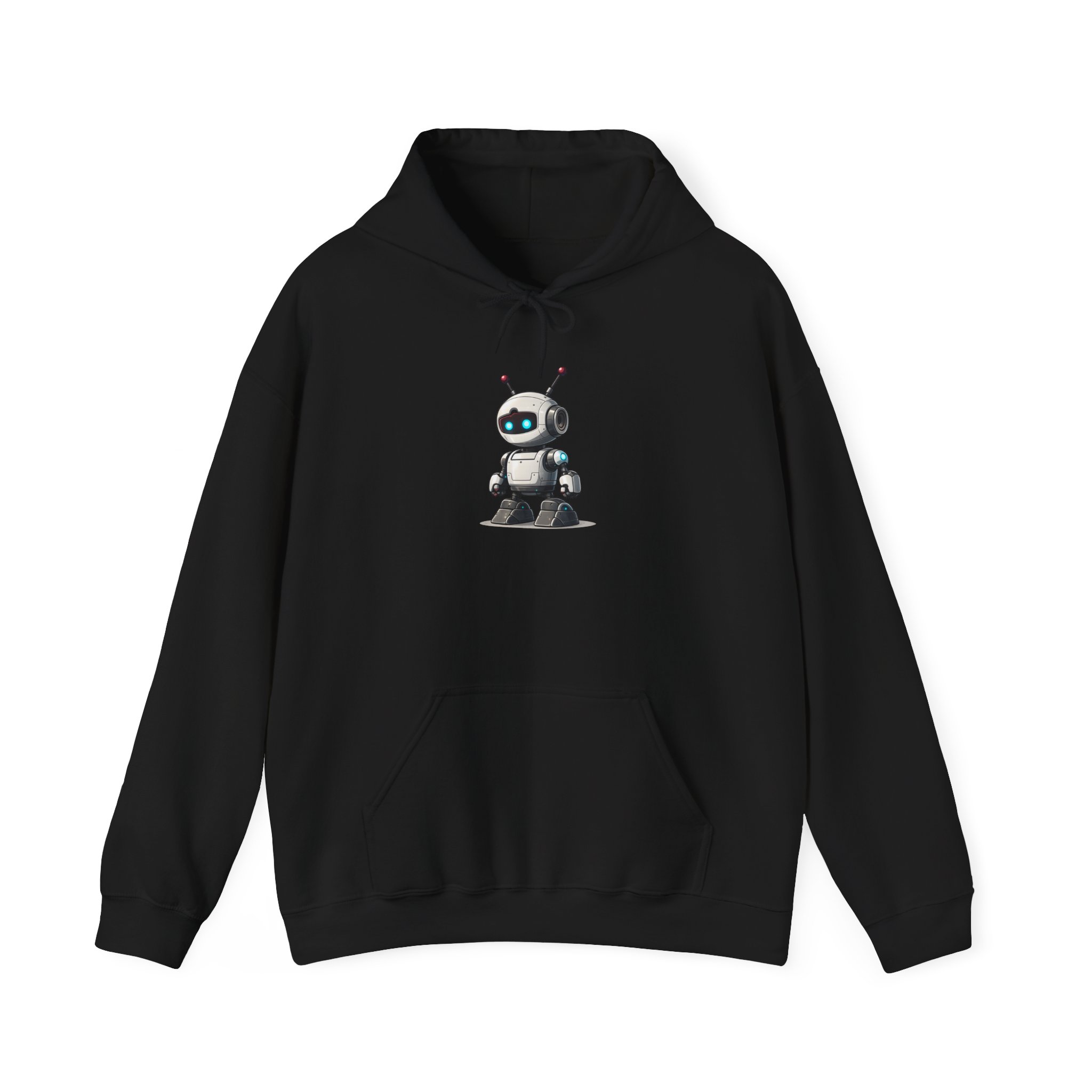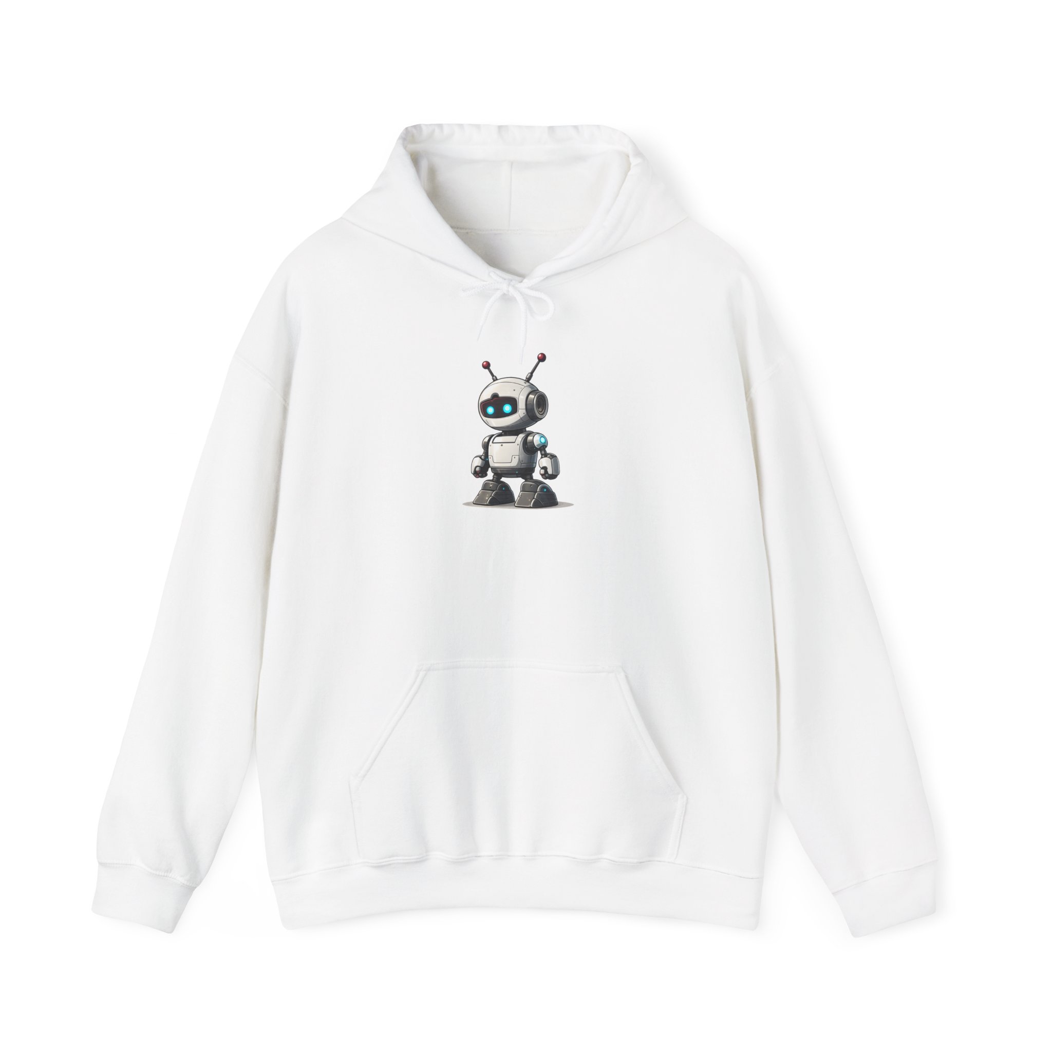 The larger canvas of a pullover hoodie gives this character the full presence it deserves. The compact white robot stands centered on black fleece — dual red antennas, glowing cyan visor eyes, camera module, chunky accent-lit boots — with the quiet confidence of something that was built to handle whatever you throw at it. Warm. Well-constructed. The kind of hoodie that gets complimented by people who don’t normally comment on clothing, because the character is just that well designed.