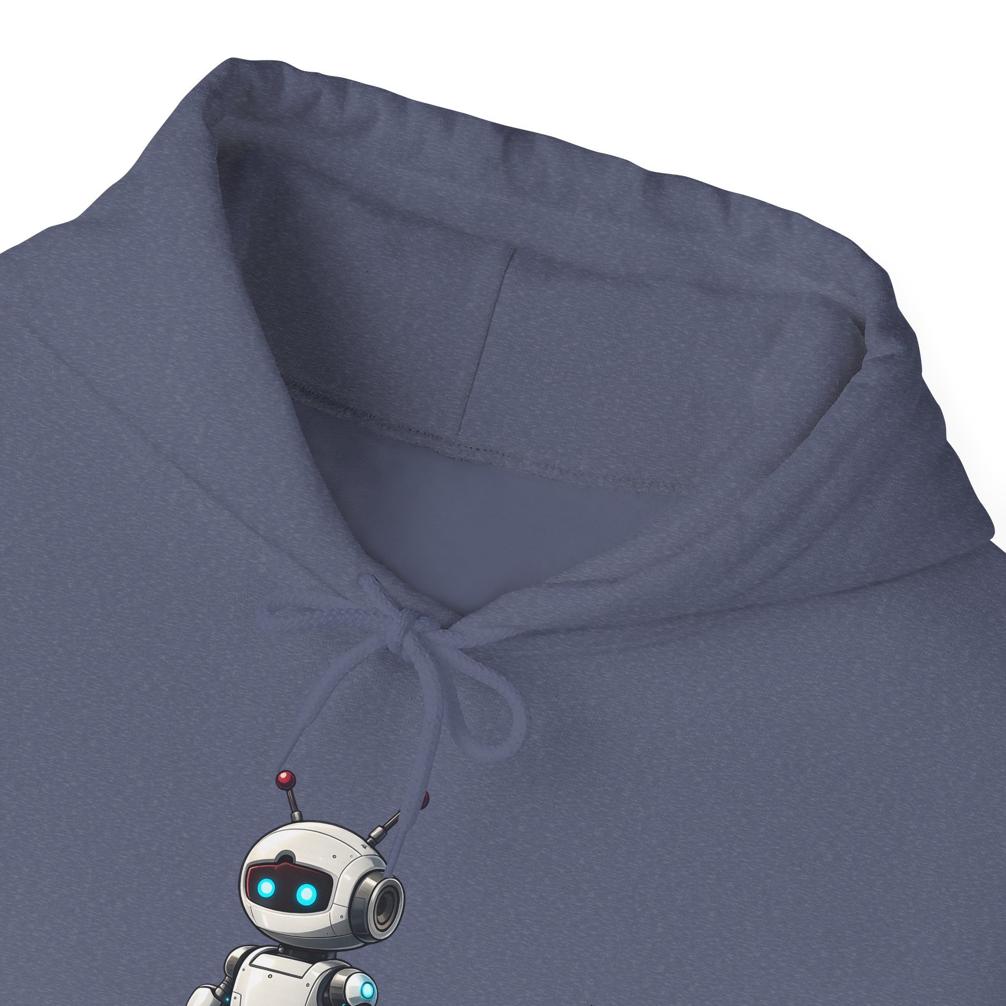• ✅ Clean character print at hoodie scale — white, grey, and cyan robot detail holds sharp on fleece