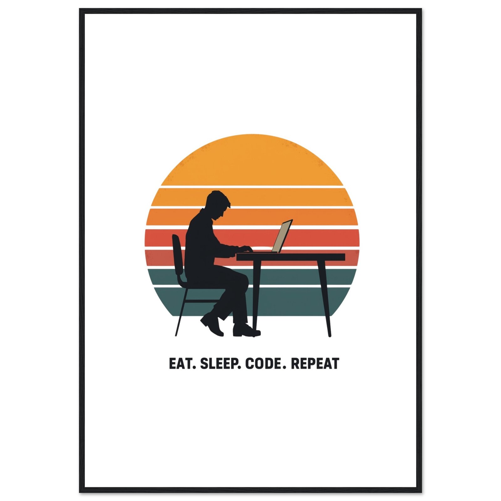 For every dedicated coder—this t-shirt features a retro silhouette of a programmer at work with the iconic slogan “Eat. Sleep. Code. Repeat.” Perfect gift for software developers, web designers, and computer geeks.