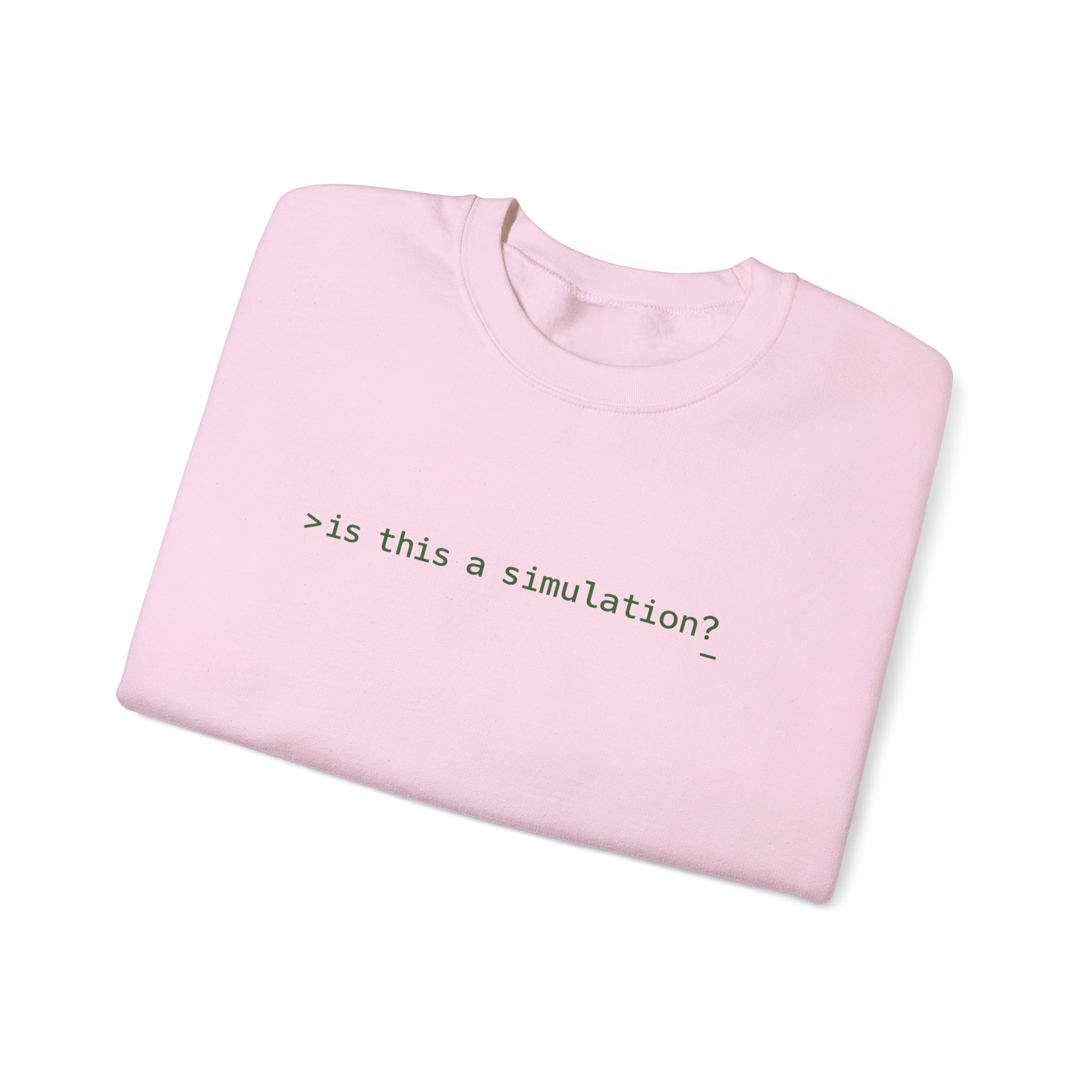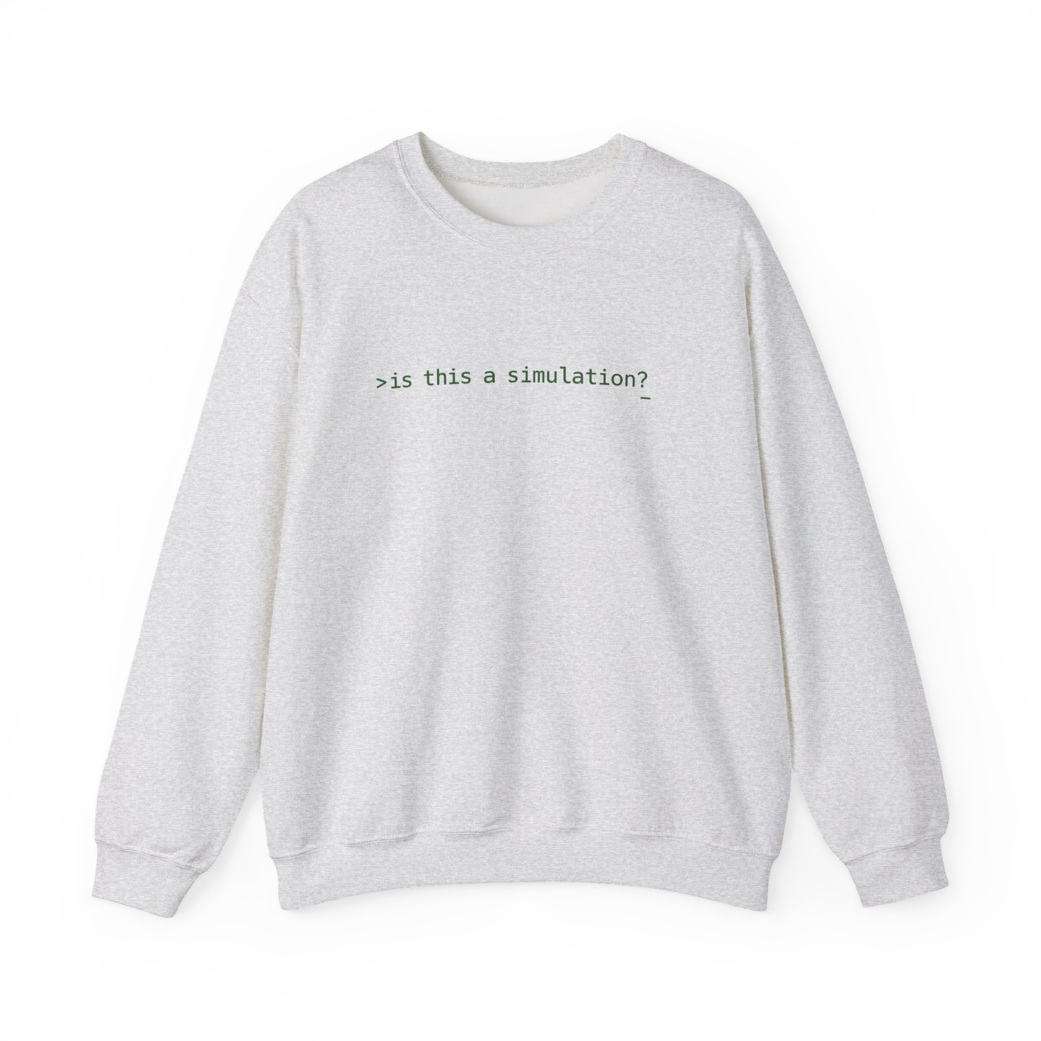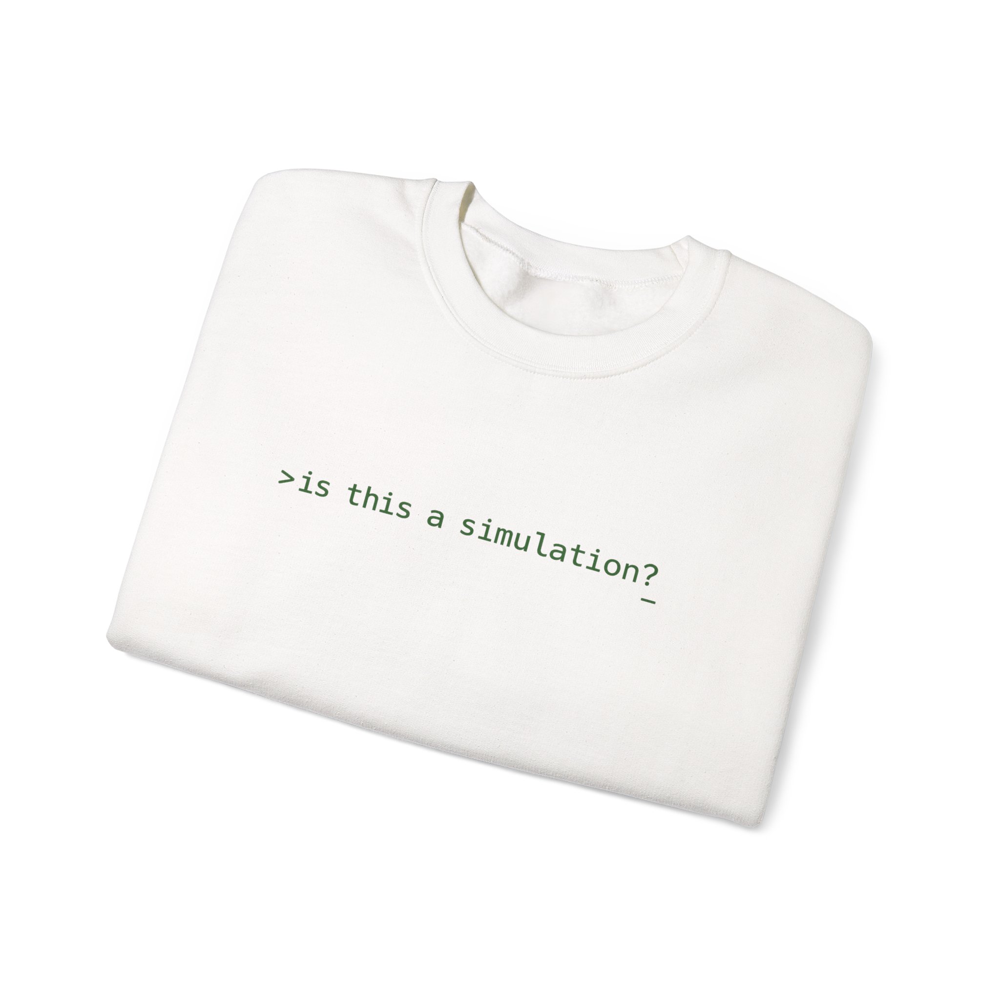 The crewneck format is the right canvas for this design. Clean collar, uninterrupted black fleece, and a single terminal prompt centered with the precision of someone who actually thinks about whitespace. >is this a simulation?_ in terminal phosphor green. Monospace. Cursor included. The question that sits at the intersection of computer science, cosmology, and 2am — typed into the void like a function call with no documented return type. Worn by the kind of person who finds that funny in exactly the right way. This is minimalist dark apparel executed at the level where restraint becomes the statement.