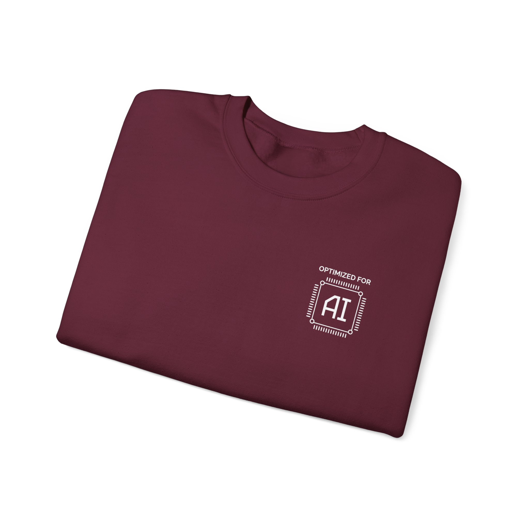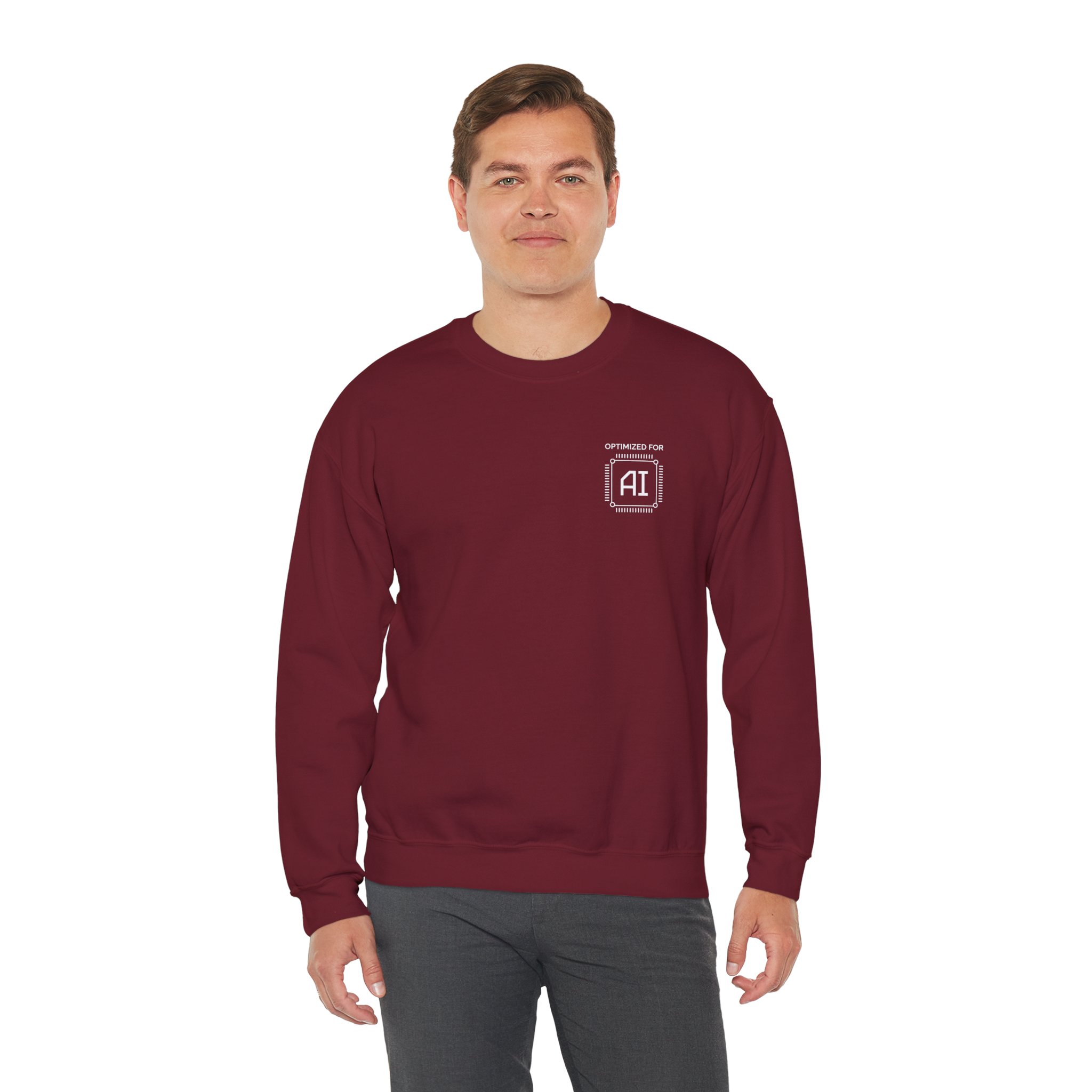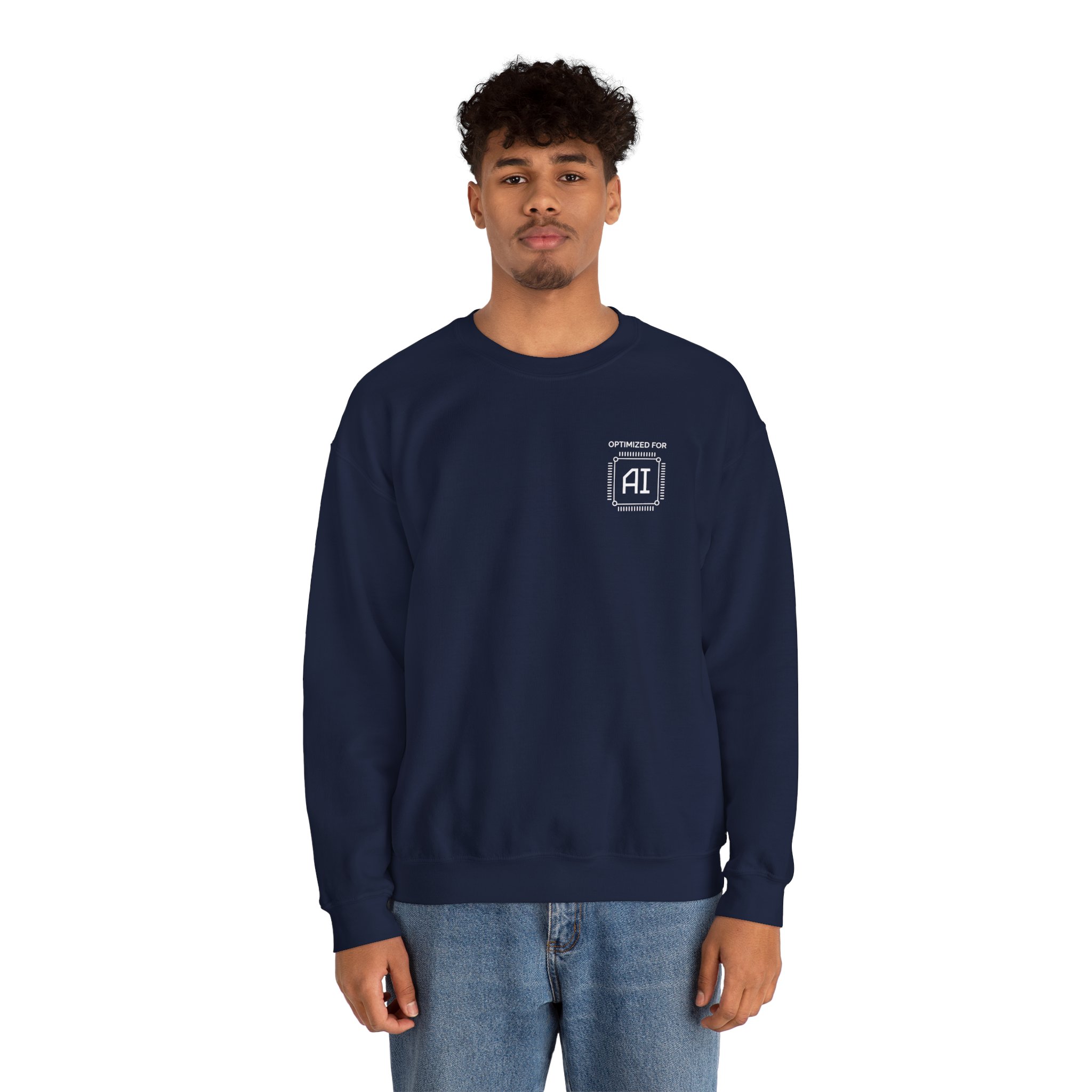 Minimal chest badge on a structured crewneck. That’s the whole brief and it executes perfectly. White technical processor badge on black fleece, sitting exactly where a hardware specification label would go if human professionals came with one. No tagline. No background graphic. No explanation. Just “OPTIMIZED FOR AI” in the precise visual language of the field itself — and the quiet confidence of someone who genuinely is.