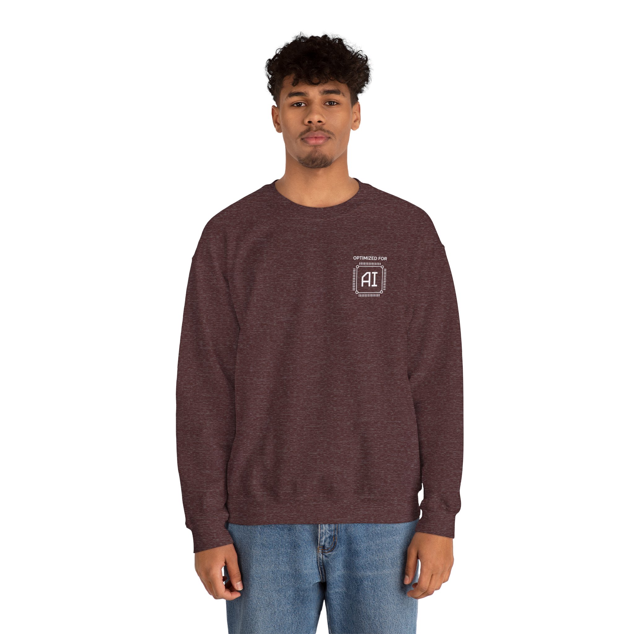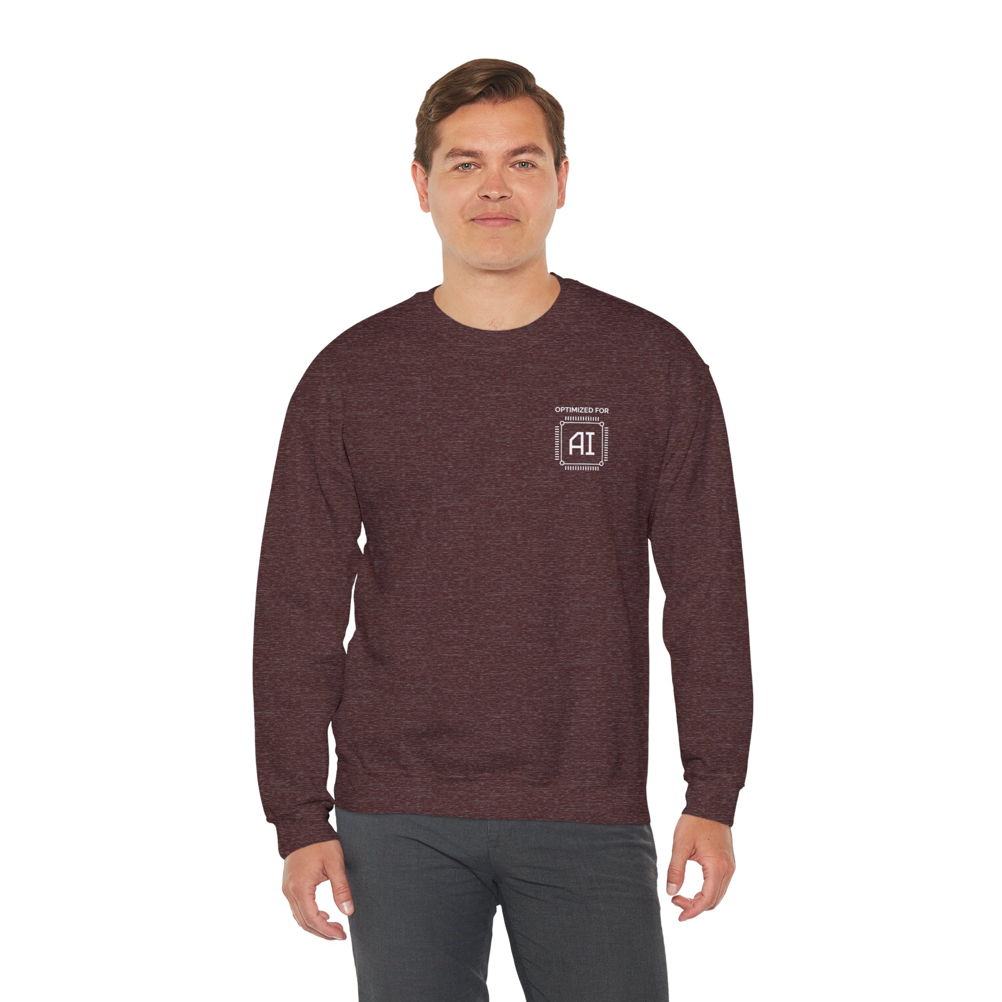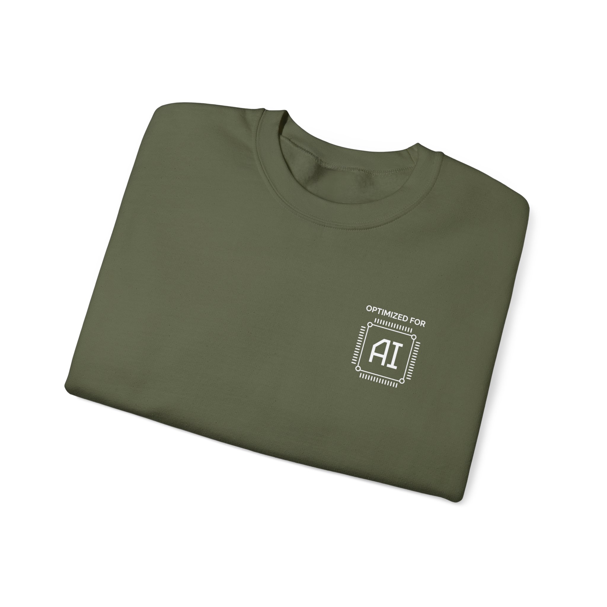 Minimal chest badge on a structured crewneck. That’s the whole brief and it executes perfectly. White technical processor badge on black fleece, sitting exactly where a hardware specification label would go if human professionals came with one. No tagline. No background graphic. No explanation. Just “OPTIMIZED FOR AI” in the precise visual language of the field itself — and the quiet confidence of someone who genuinely is.