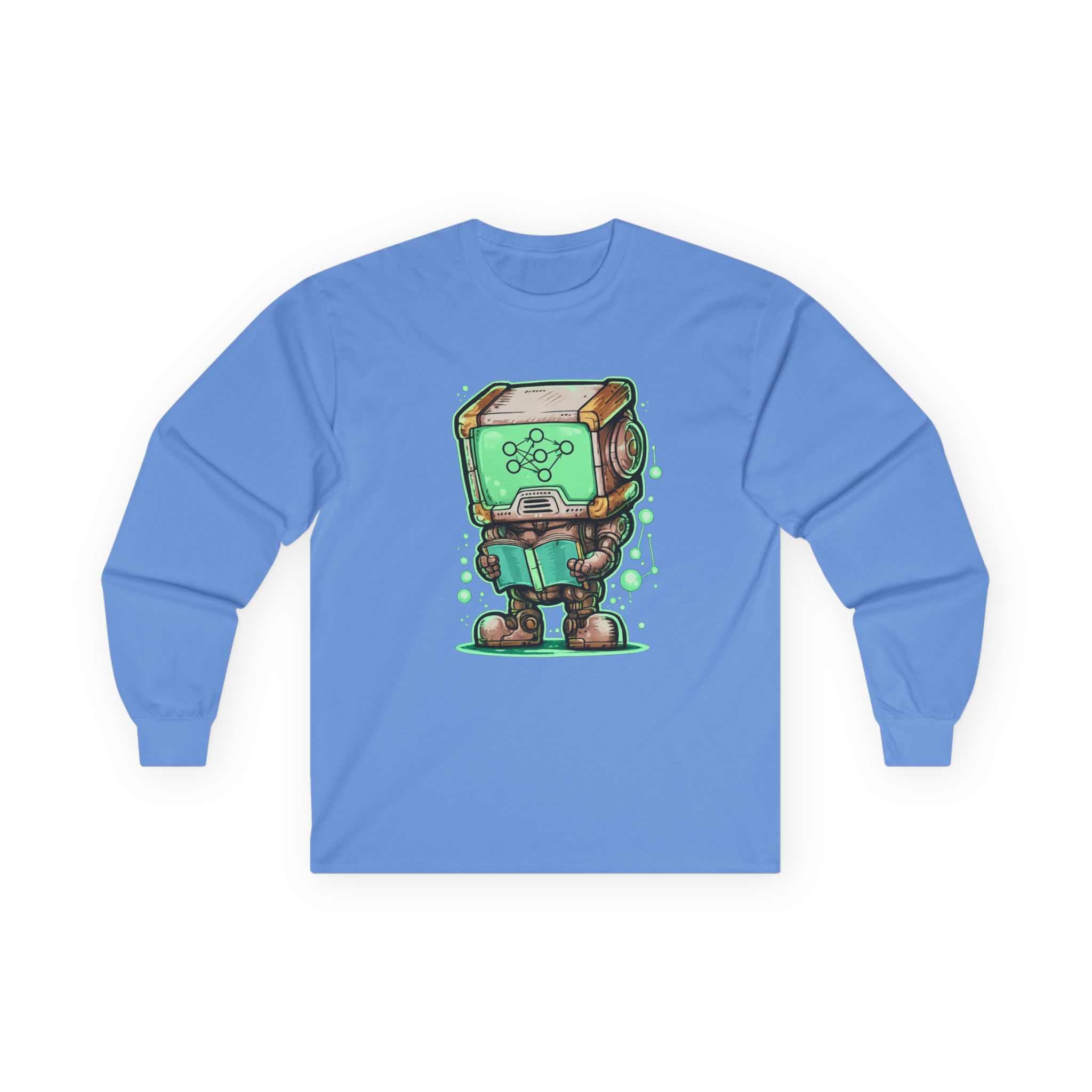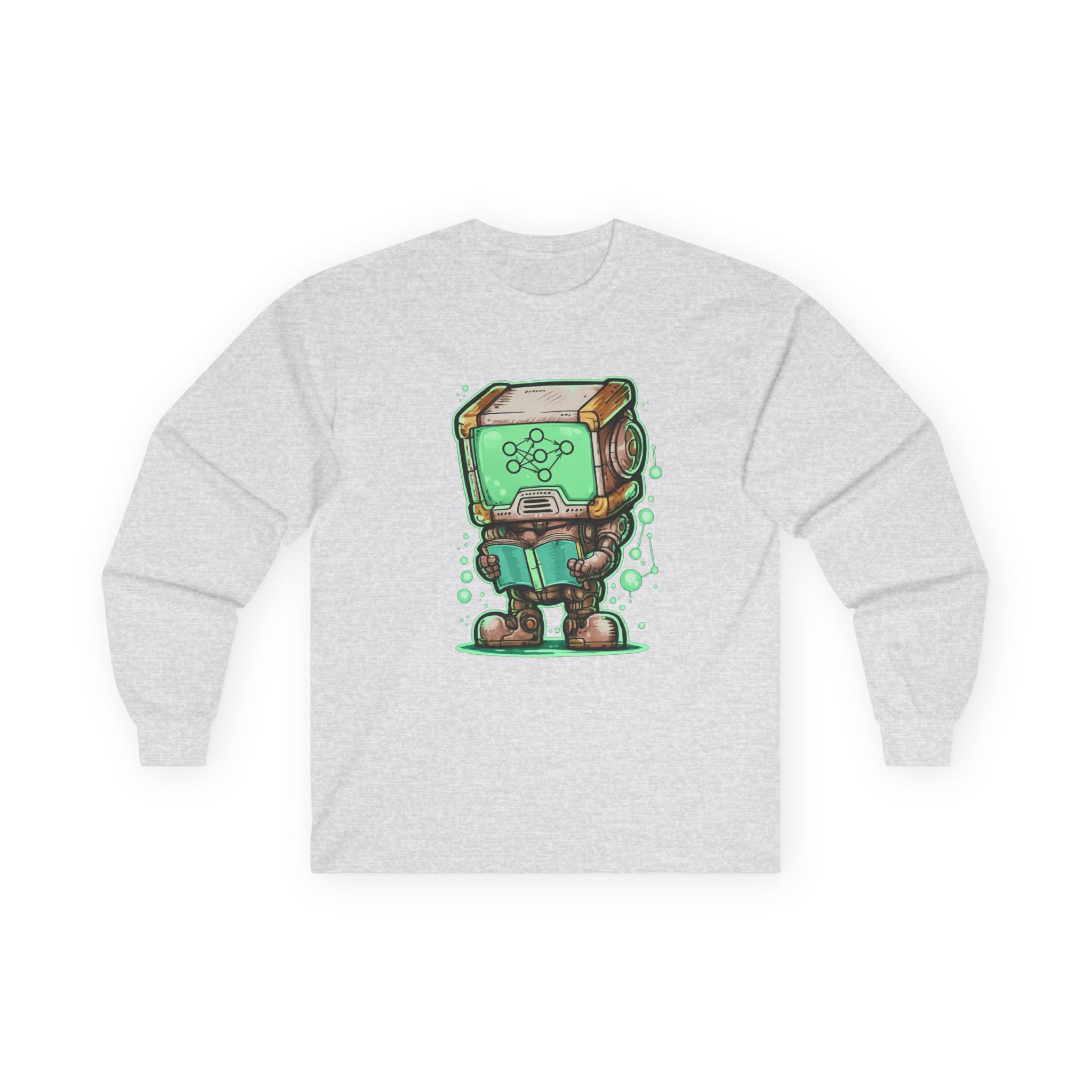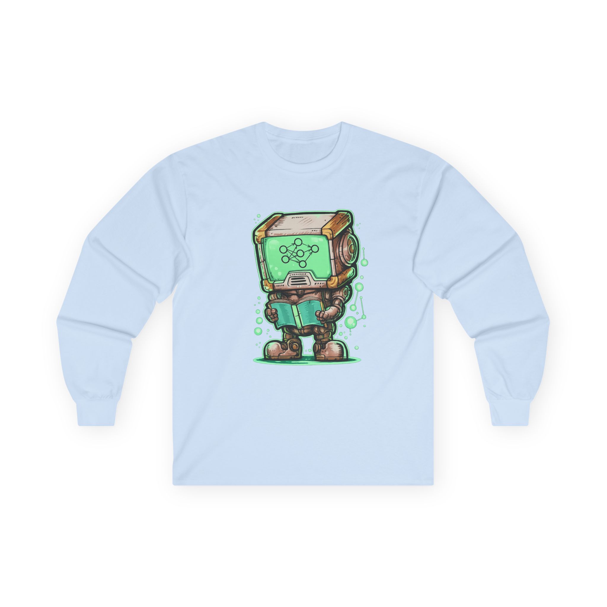 This glowing retro robot — stocky, focused, neural network lighting up its screen-face — is mid-training and completely unbothered. The illustration blends old-school sci-fi charm with the visual language of modern machine learning: nodes, connections, data flowing in real time. It’s a design that feels like it belongs on the wall of a university AI lab AND looks genuinely great on a shirt. Detailed enough to reward a close look, bold enough to read across a room. Made for the people who think training models is genuinely exciting — not just a job.