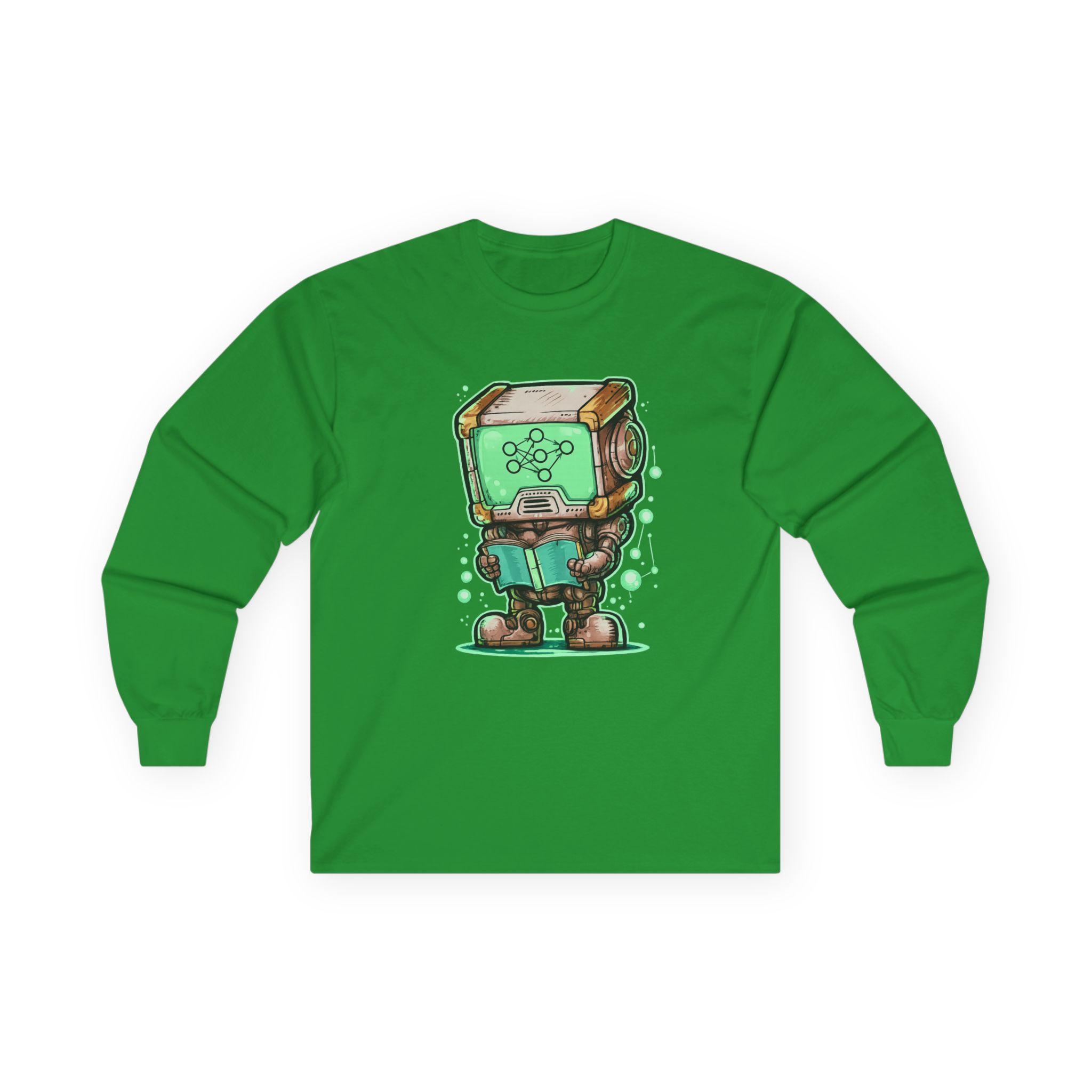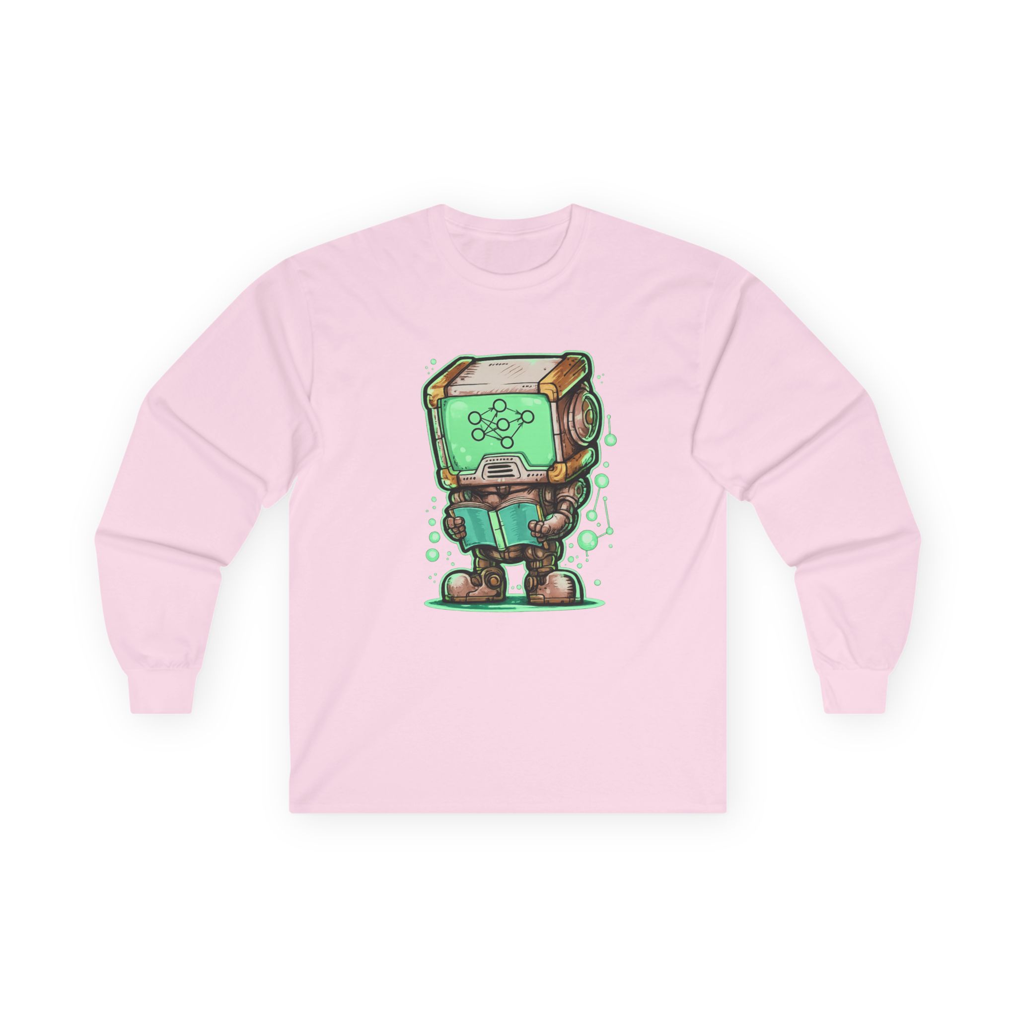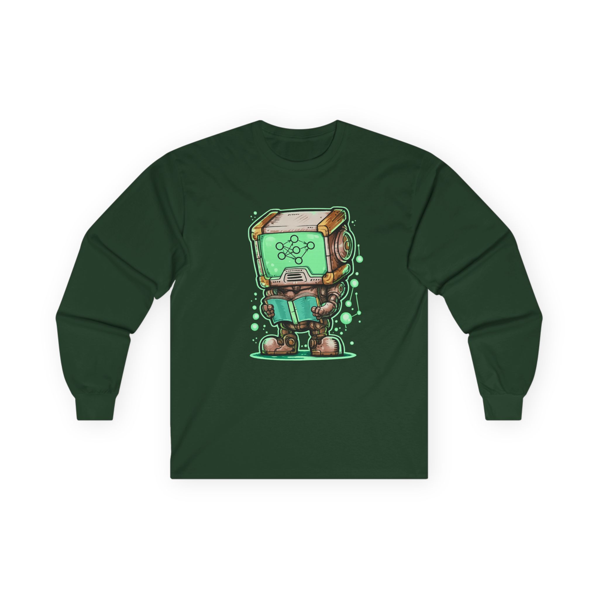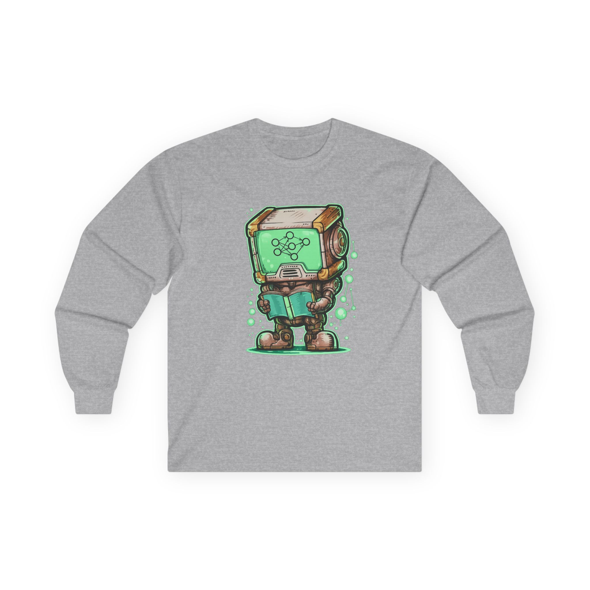 This glowing retro robot — stocky, focused, neural network lighting up its screen-face — is mid-training and completely unbothered. The illustration blends old-school sci-fi charm with the visual language of modern machine learning: nodes, connections, data flowing in real time. It’s a design that feels like it belongs on the wall of a university AI lab AND looks genuinely great on a shirt. Detailed enough to reward a close look, bold enough to read across a room. Made for the people who think training models is genuinely exciting — not just a job.