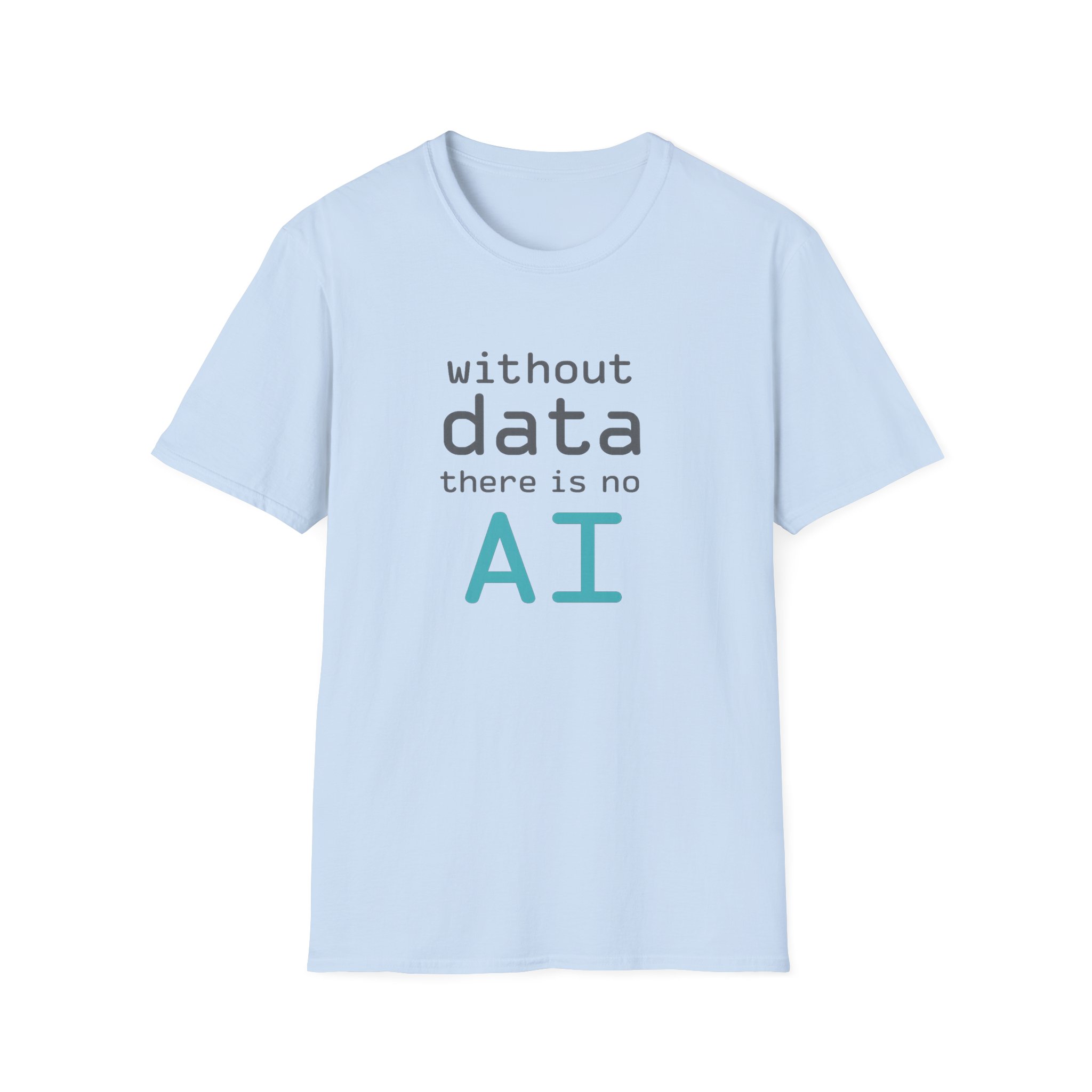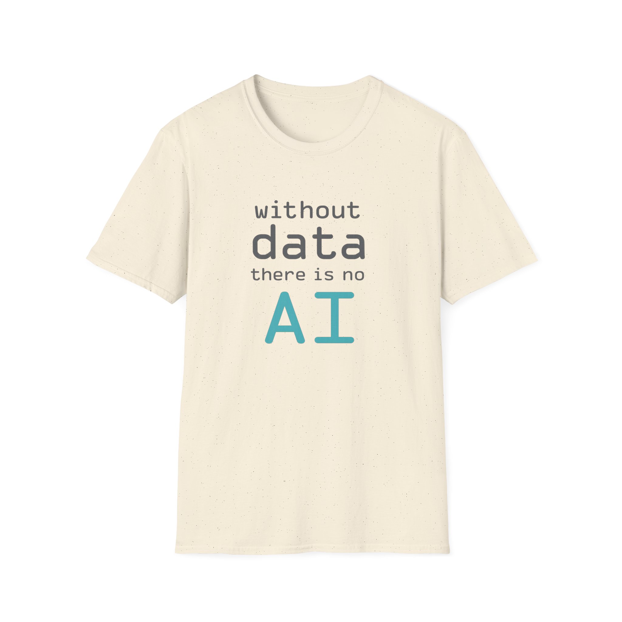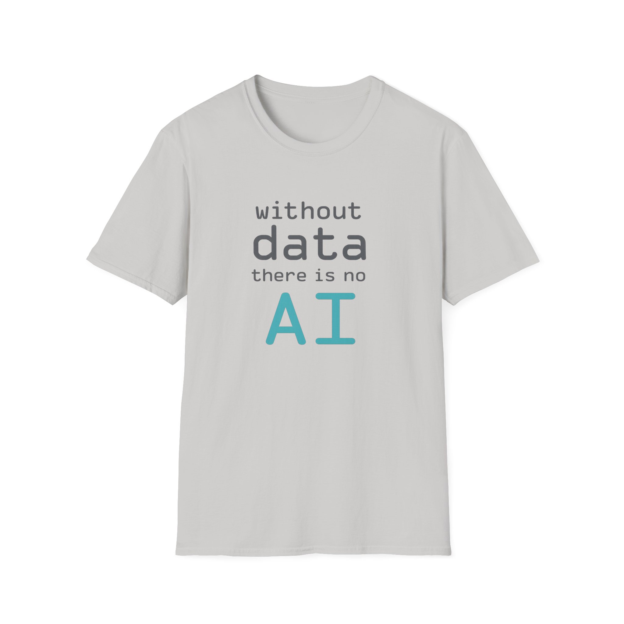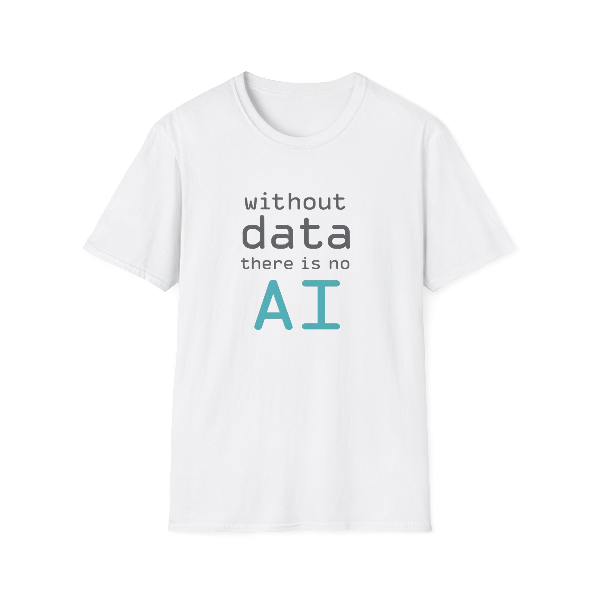 The typography does the argument in four lines. Grey to grey to grey — and then “AI” lands in electric cyan at the bottom like the payoff at the end of a very well-structured proof. Clean rounded monospace type. Minimal layout. Maximum correctness. This is the shirt for the person in every AI conversation who quietly knows which part of the stack everyone else is taking for granted — and has the SQL scars to prove it.